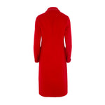 Slightly fitted cherry-colored coat with a lapel, front pockets, and button closure. Matching leather trimmed lapel. Composition: 100% virgin wool. Italian sizing.
