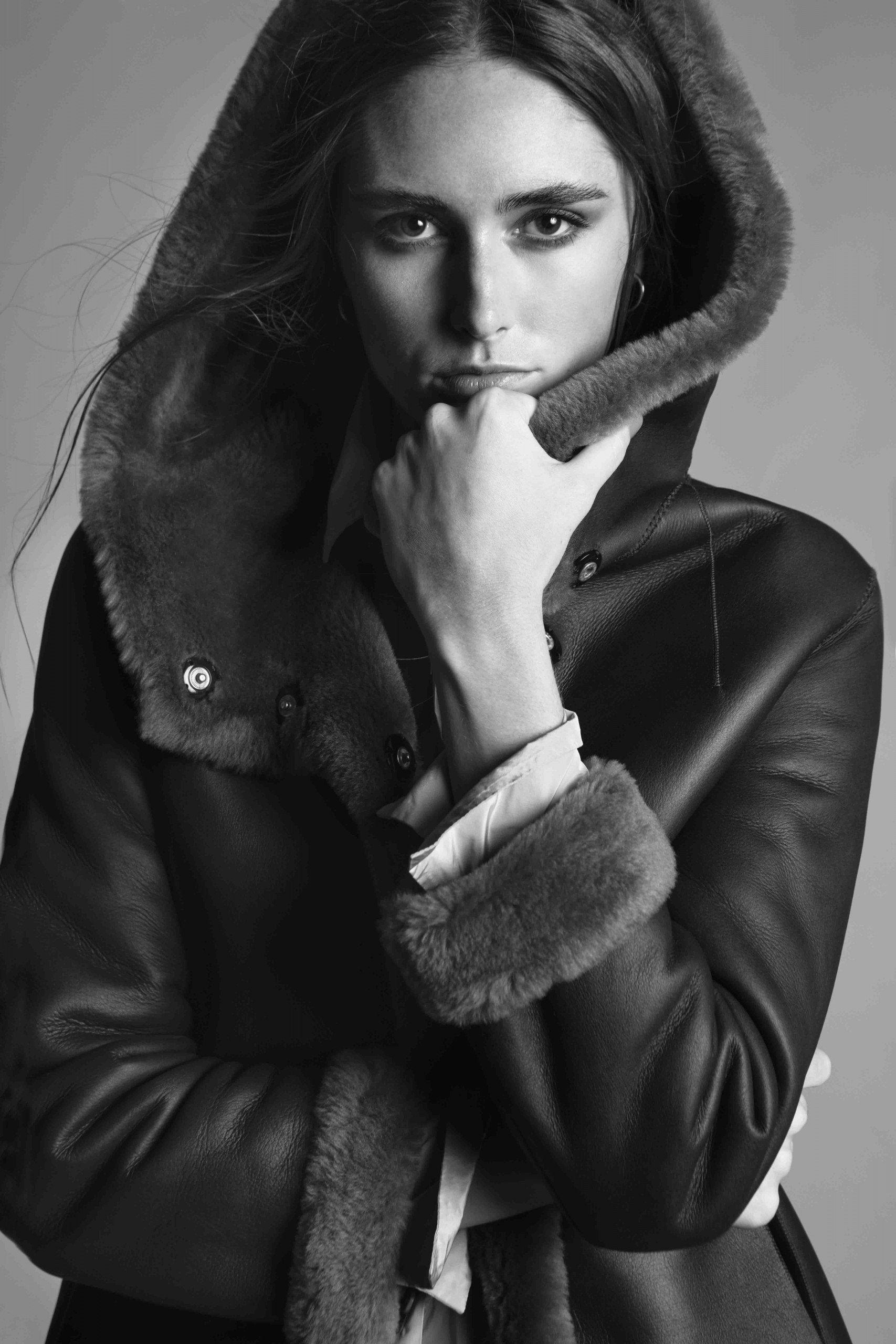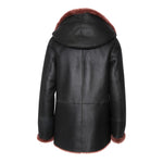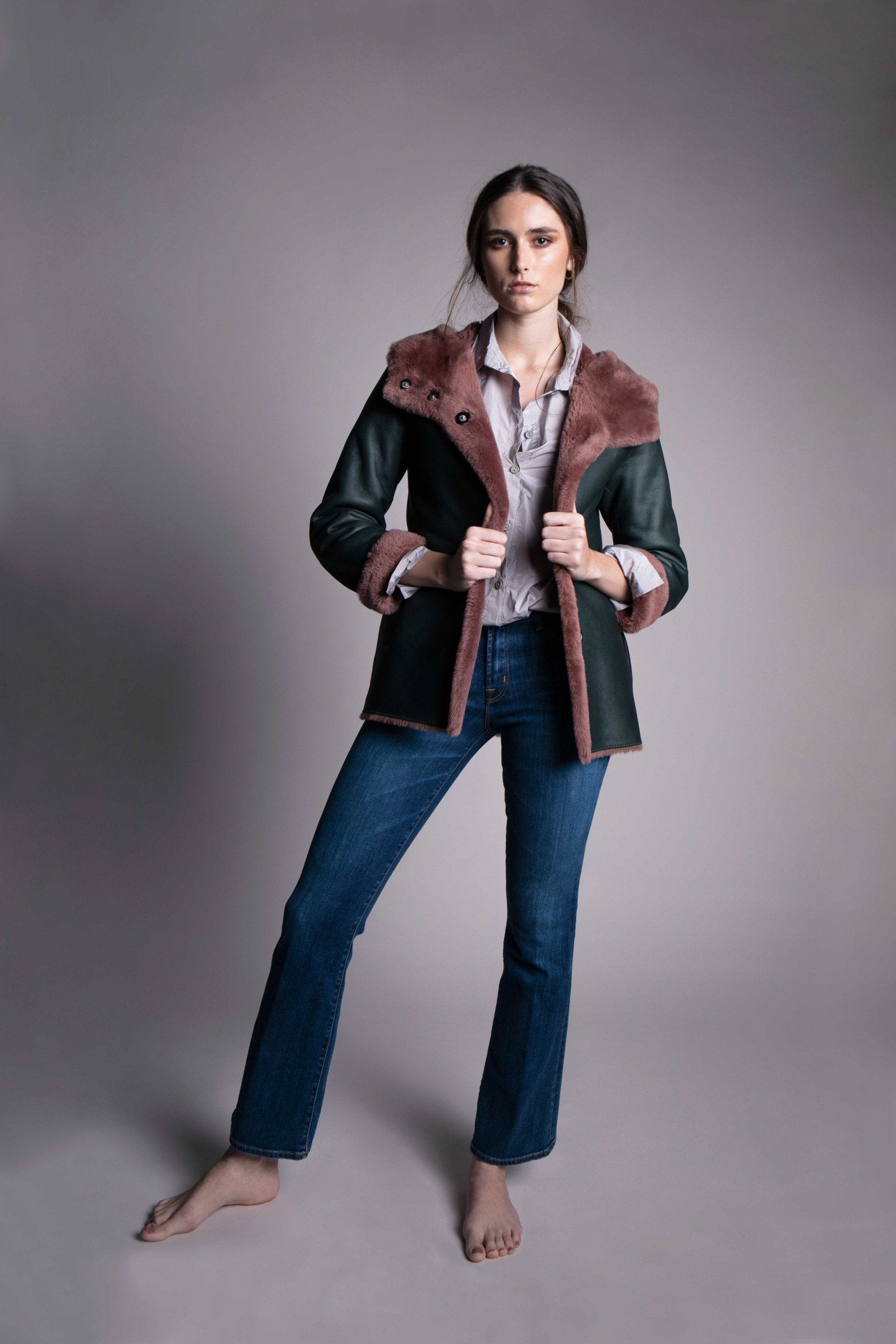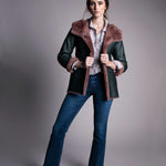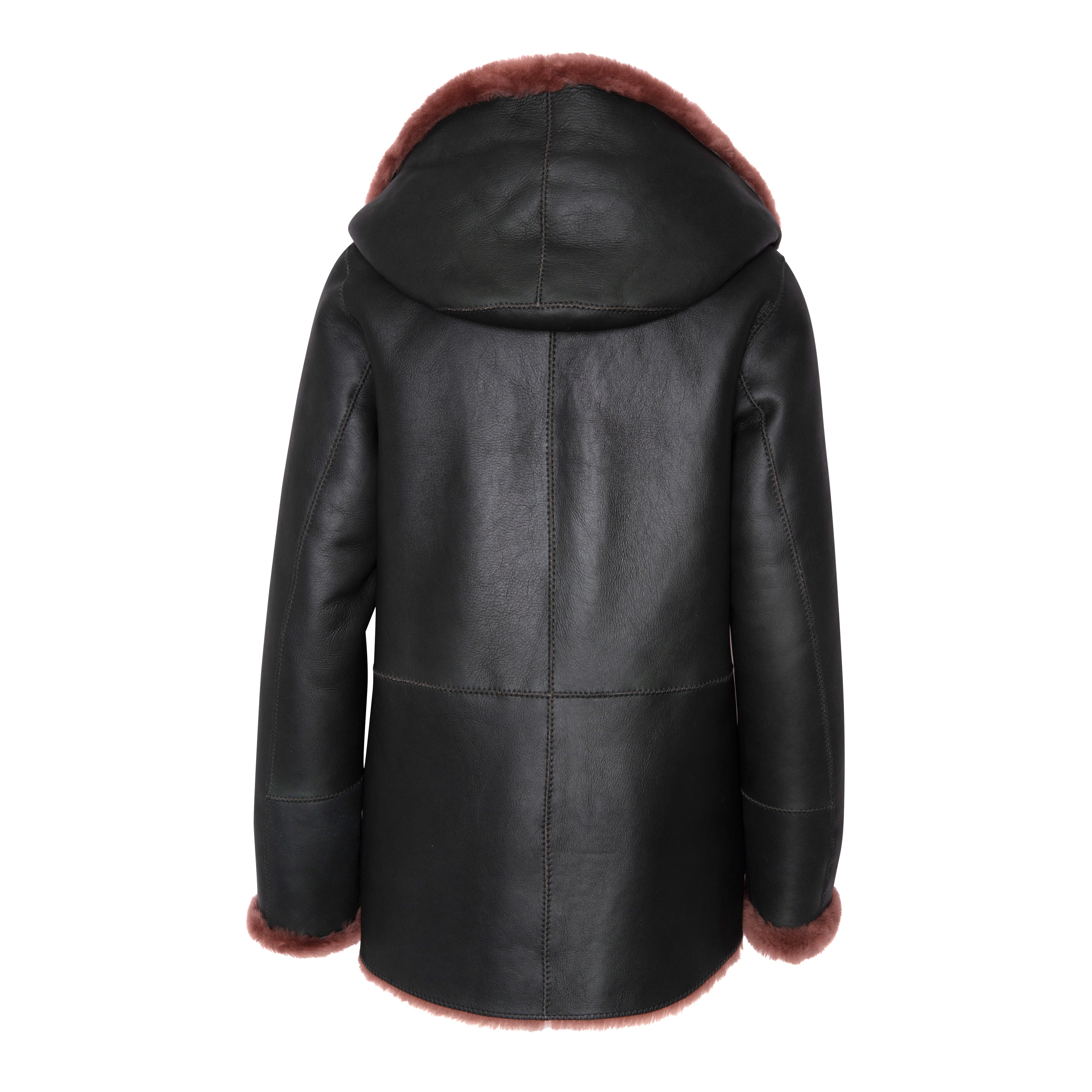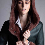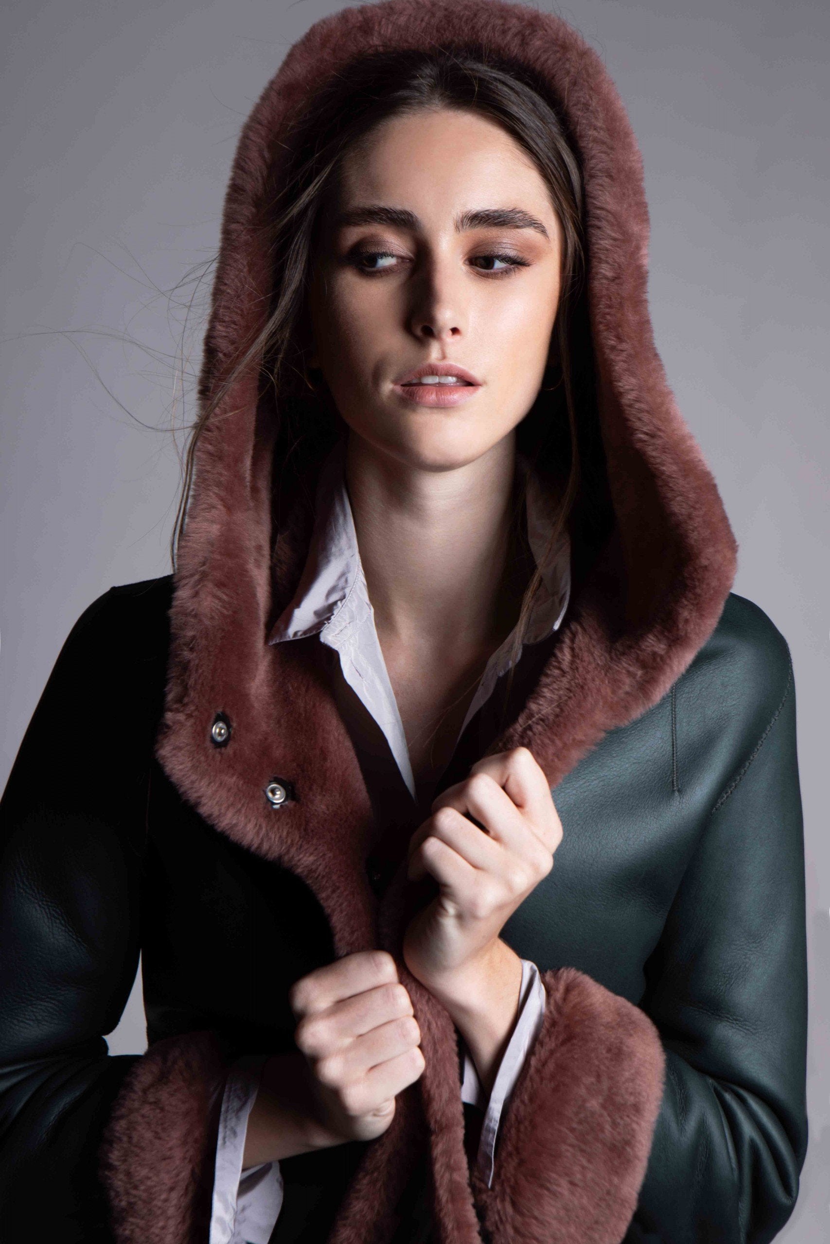 Spanish lambskin jacket with hood and nappa leather trim. Long sleeves and side pockets. Dark green nappa leather with Marsala interior. Tortoiseshell clip button. 100% Spanish lamb. Made in Spain. Spanish sizing.
