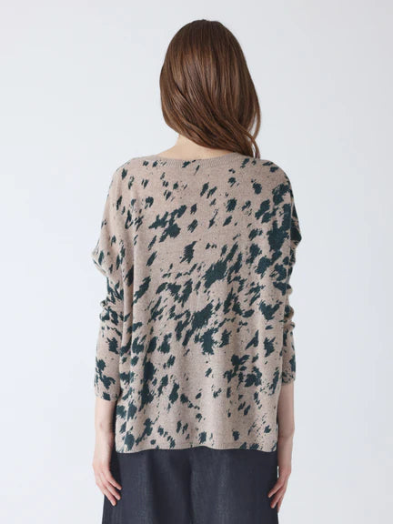 Jersey oversize de la firma francesa absolute cashmere. Cuello pico y manga larga en canalé. Aberturas laterales. Color beige con estampado de manchas en verde botella. Composición: 100% cashmere.