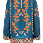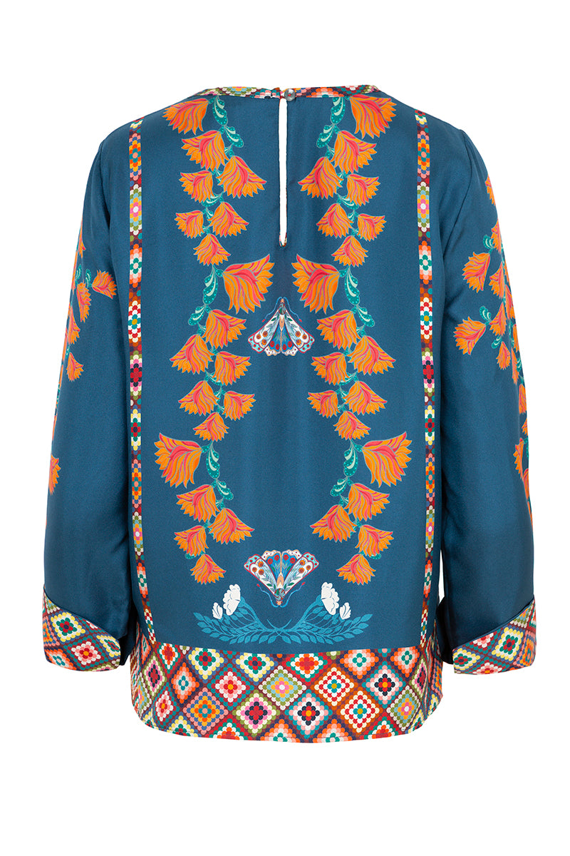 Printed silk blouse from the Italian brand Franco Ferrari. Round neckline and long sleeves. Floral print in ochre, rust, and petrol blue tones on a navy blue background. Hem and cuffs in multicolor crochet print. Slight side slits. Composition: 100% silk. Italian sizing. Made in Italy.