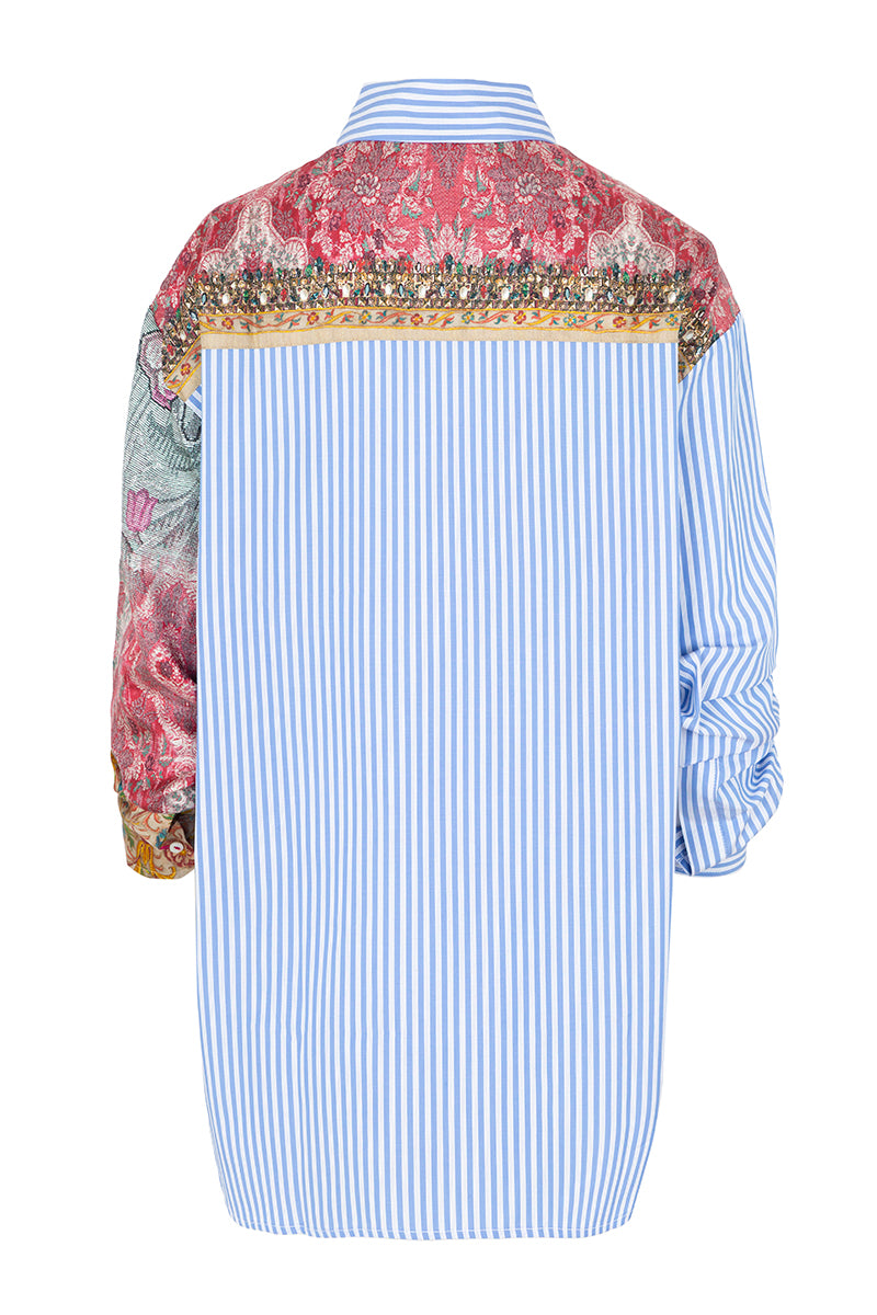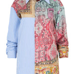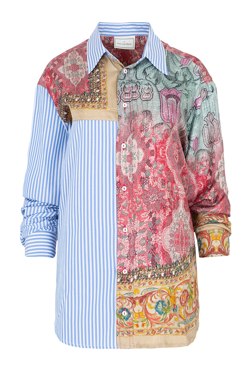 Long-sleeved shirt in a silk and cotton blend from the Italian brand Pierre-Louis Mascia. Patchwork with pajama-style stripes in blue tones and tapestry-style floral print with baroque details, decorated with stones, sequins, studs, and vintage floral print. Composition: 83% Cotton, 17% silk. Made in Italy. Italian sizing.