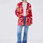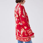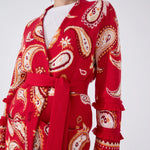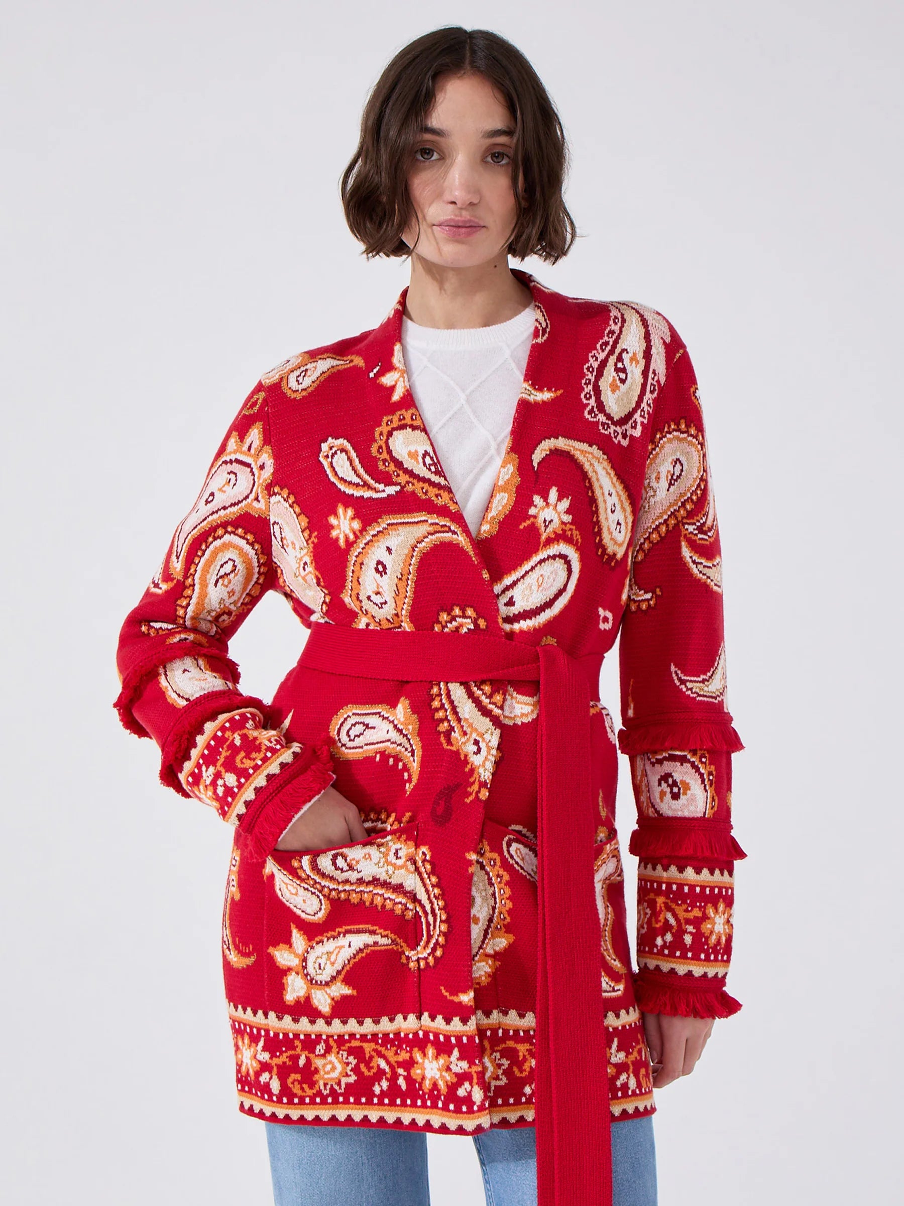 Jacquard knit jacket from the English brand Hayley Menzies. Long sleeves and front pockets. Red braid fringe detail on the sleeves. Paisley print in salmon, burgundy, beige, and off-white tones, with small copper thread details, on a red background. Hem finished with a border in the same tones. Includes a red knit belt. Composition: 100% cotton.