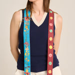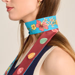 Double-sided silk sash with a multicolored floral print and tennis balls on a maroon background. A very versatile accessory with multiple uses: belt, headband, necklace, neck bow...