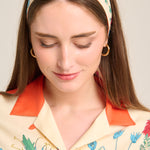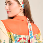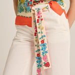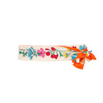 Double-sided silk headband with a multicolored floral print and tennis balls on an orange background. A very versatile accessory with multiple uses: belt, headband, necklace, neck bow...