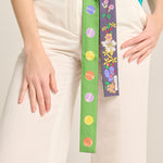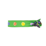 Double-sided silk headband with a multicolored floral print and tennis balls on a green background. A very versatile accessory with multiple uses: belt, headband, necklace, neck bow...
