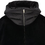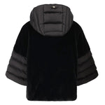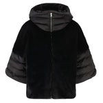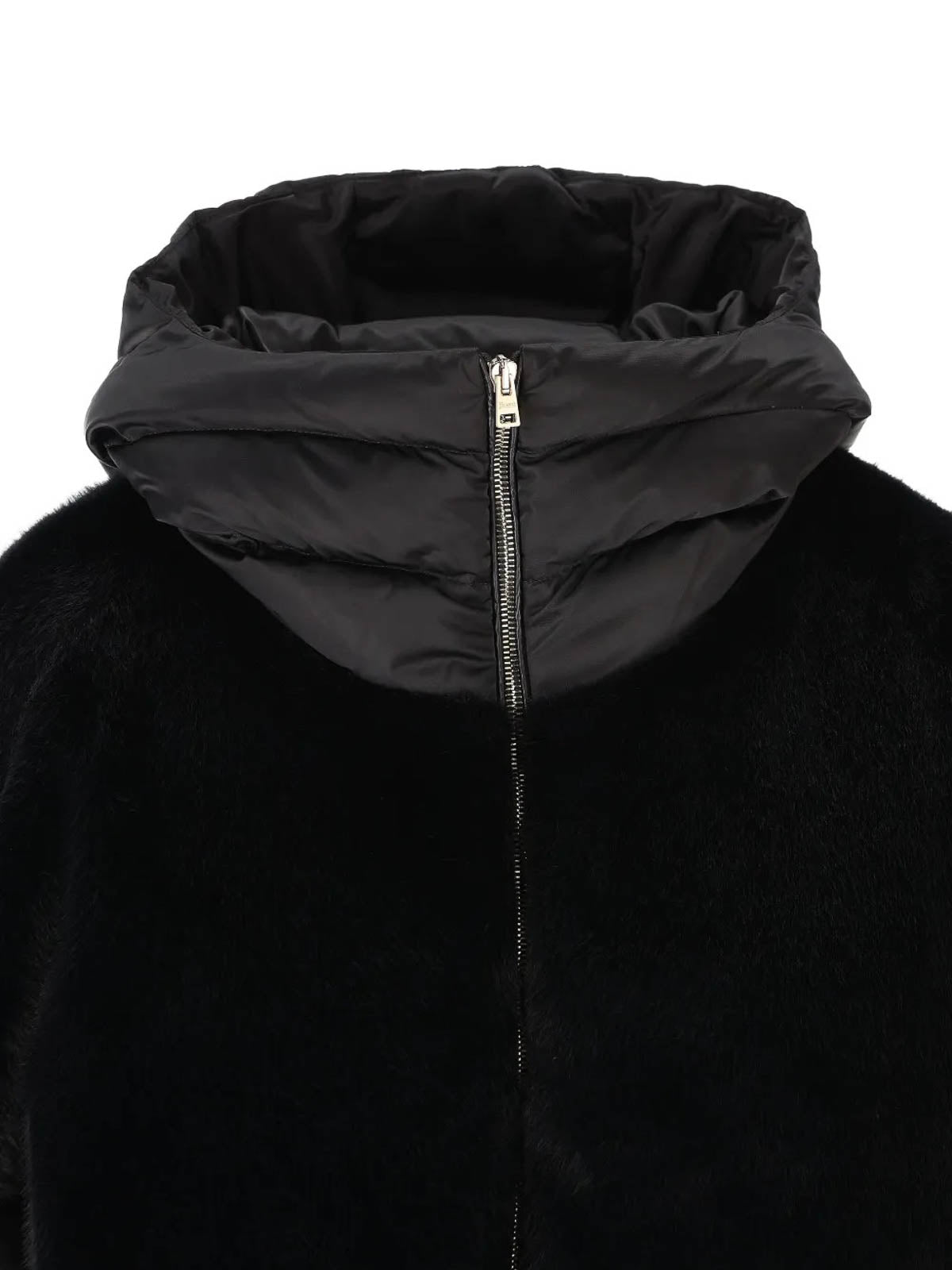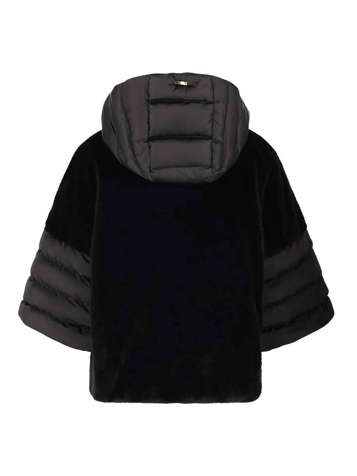 Ultra-lightweight short goose down jacket from the Italian brand Herno. A combination of eco-fur and classic quilting. Features three-quarter sleeves, a hood, side pockets, and a double-zipper closure. Black. Composition: 100% polyester. Filling: 80% down, 20% feather. PI002132D. Italian sizing.