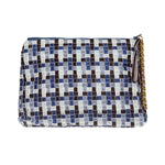Braided velvet handbag by the Italian brand Maliparmi. Blue zipper closure and gold chain handle. Combination of blue and gray tones. Composition: 100% Polyester.
