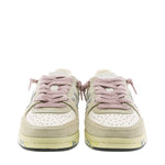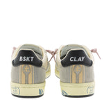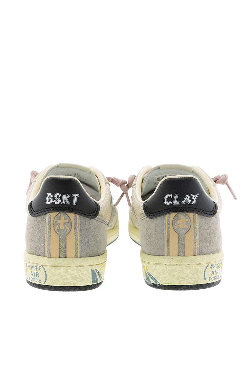 Basketball sneaker, variant 6927. Outer fabric in perforated white leather and silver glitter with a tone-on-tone leather logo. Rounded toe and heel detail in gray suede and black leather. Cotton laces in pale pink. Extra comfort sole and insole.