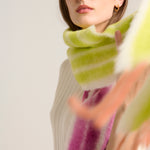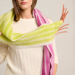 Fringed scarf by Italian brand Faliero Sarti. Style model with a strawberry and lime striped print. Made in Italy. Composition: 80% Alpaca, 20% Nylon. Measurements: 35x215.