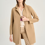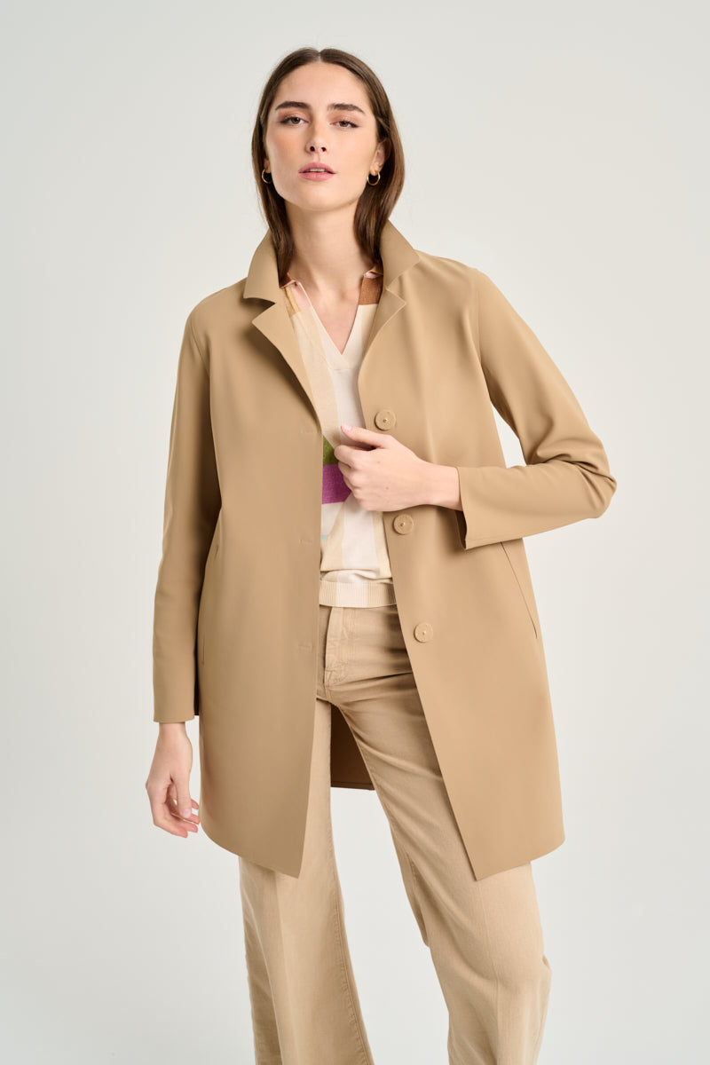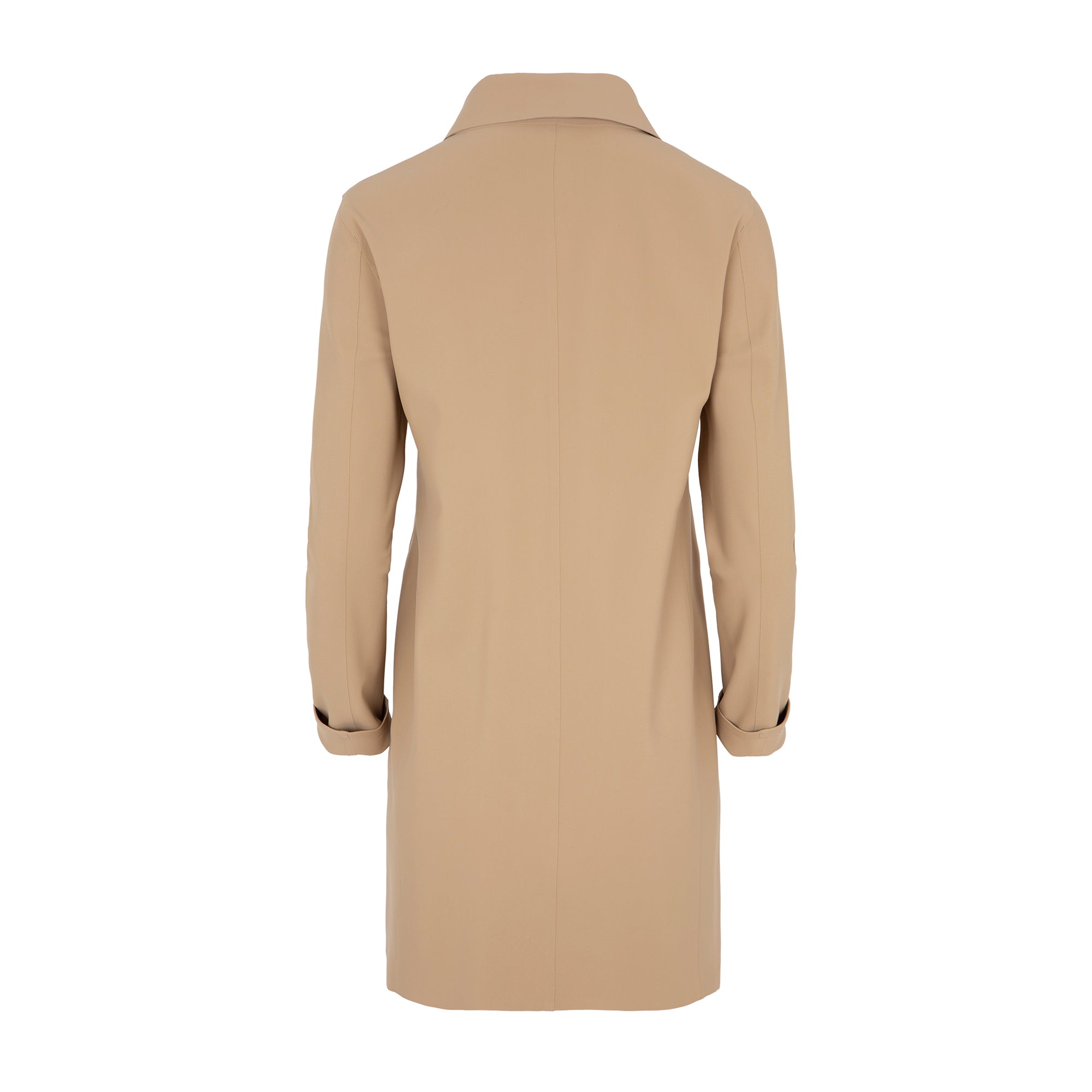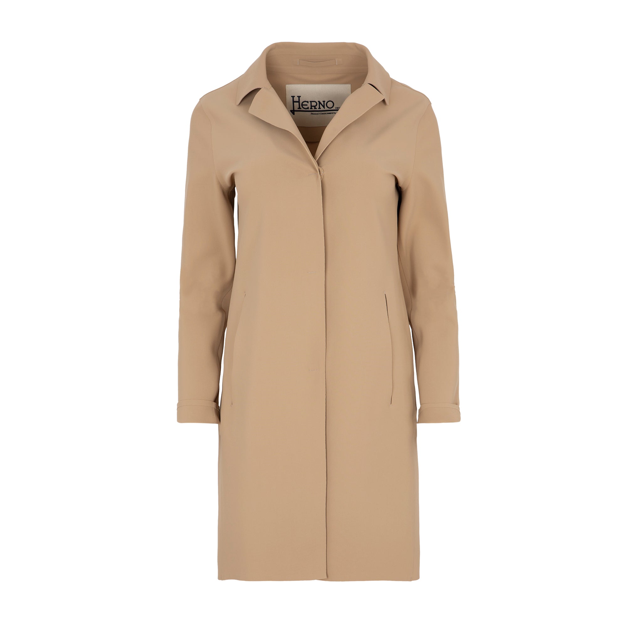 Trench coat by Herno, in camel-colored neoprene. The garment is laser-cut with invisible pockets and heat-sealed seams. Mid-calf length with notched lapel collar, snap button closure covered on the placket, and structured design. Composition: 75% Polyamide, 25% Elastane. Ref: CA00521D-13455S-2157