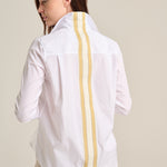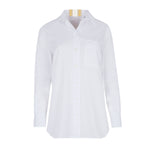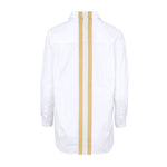 Camisa blanca de algodón, ligeramente oversize con bolsillo en la parte delantera. Detalle de cinta de tapicería en color blanco, mostaza y beige en la parte trasera. Composición: 100% Algodón. Hecho en España.