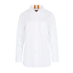 Slightly oversized white cotton shirt with a front pocket. Ecru tapestry detail with pink, mustard, and crimson stripes on the back. Composition: 100% cotton. Made in Spain.