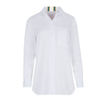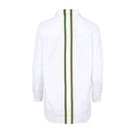 Camisa blanca de algodón, ligeramente oversize con bolsillo en la parte delantera. Detalle de cinta de tapicería en color blanco, turquesa, mostaza y negro en la parte trasera. Composición: 100% Algodón. Hecho en España.