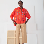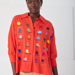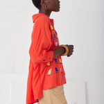 Coral oversized shirt. Asymmetrical, 3/4-length, gathered Japanese sleeves. Button closure with flap. Embroidered color palette. Composition: 100% cotton. Handmade.