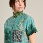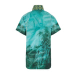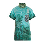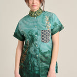 Short-sleeved shirt with a Mao collar, front pocket, button closure, and side vents. Landscape print in shades of petrol green, bottle green, beige, and black, with a matching geometric motif border on the collar and pocket. Composition: 100% cotton. Made in Italy. Italian sizing.