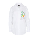 Hand-painted, slightly oversized white cotton shirt with long sleeves and a front pocket. A tribute to Madrid with the bear and strawberry tree on the back. Hand or machine wash inside out without rubbing. Iron inside out before first wash. Composition: 100% Cotton. Made in Spain.