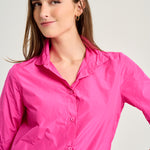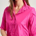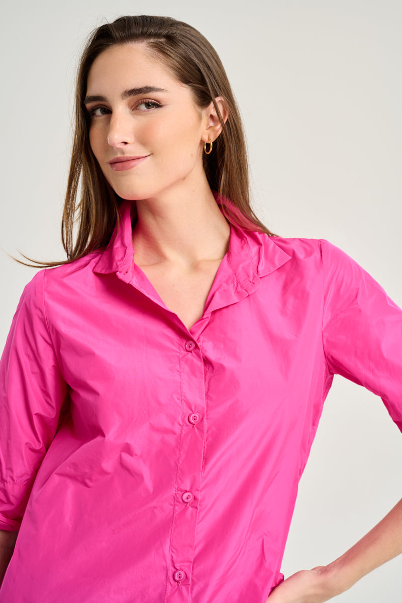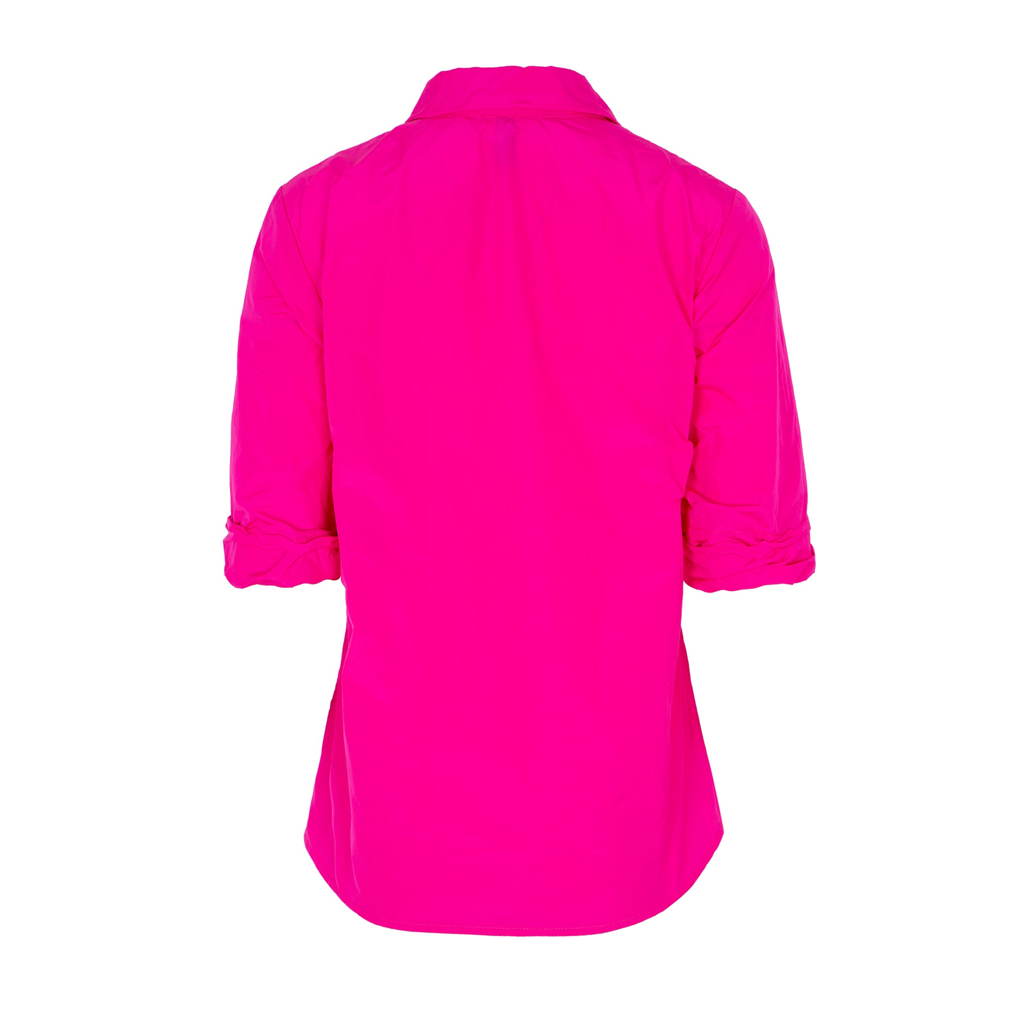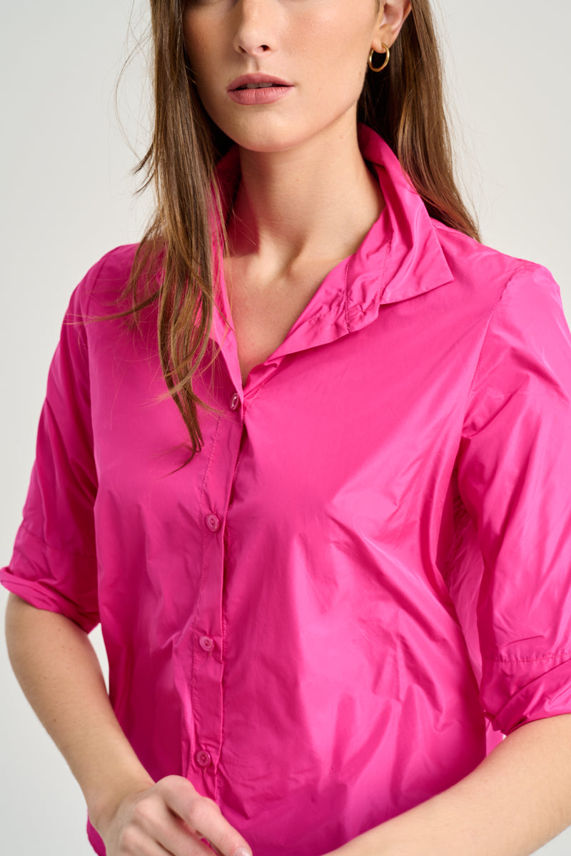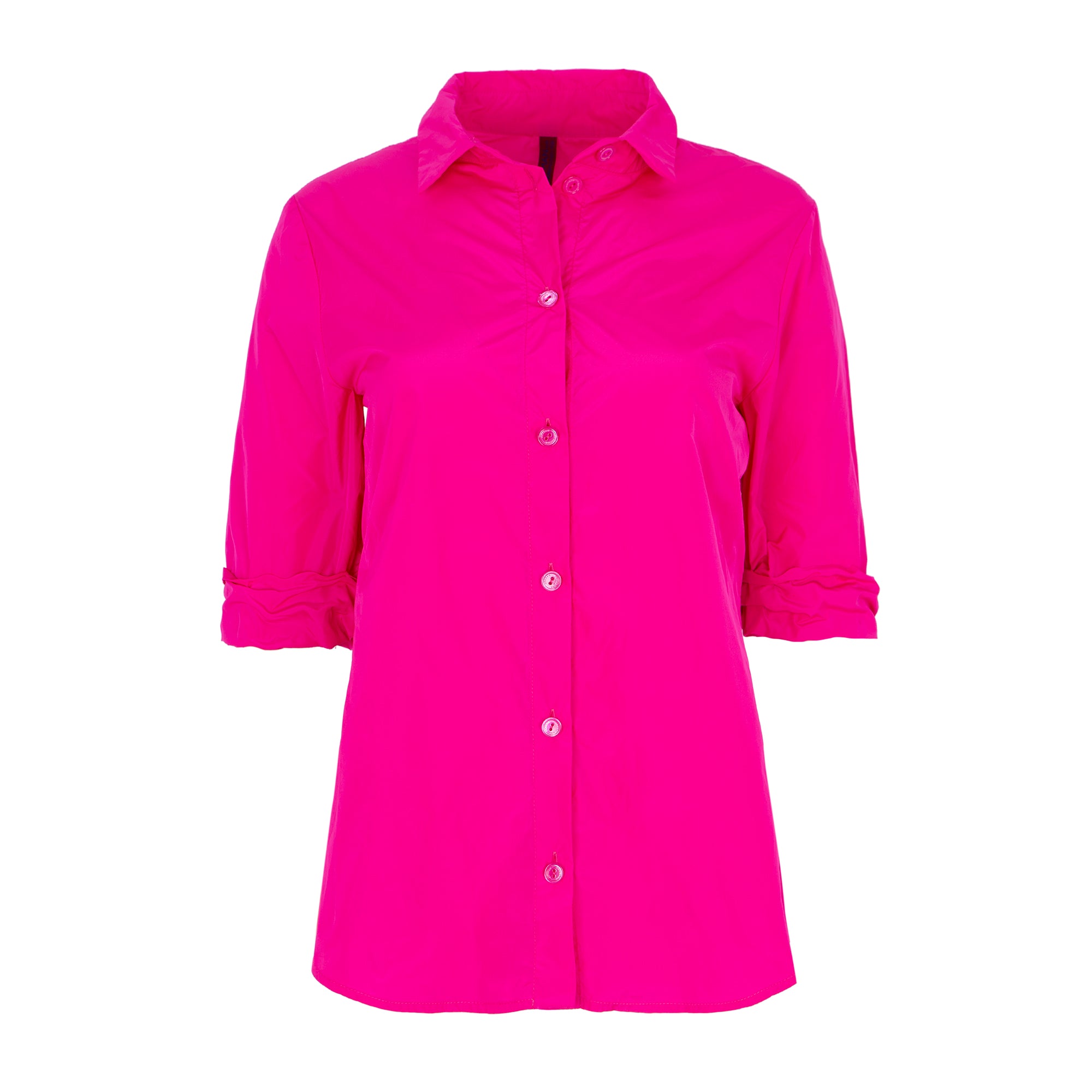 Straight-cut, technofabric shirt with a shirt collar, matching buttons, and 3/4-length sleeves. Fuchsia. Composition: 100% Polyester. This fabric cannot be ironed. German sizing.