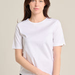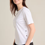 White round-neck, short-sleeved T-shirt from Herno. It features a side opening with gold snap buttons and a lamé fabric detail with the Herno logo in black. Composition: 100% cotton. Italian sizing.