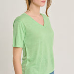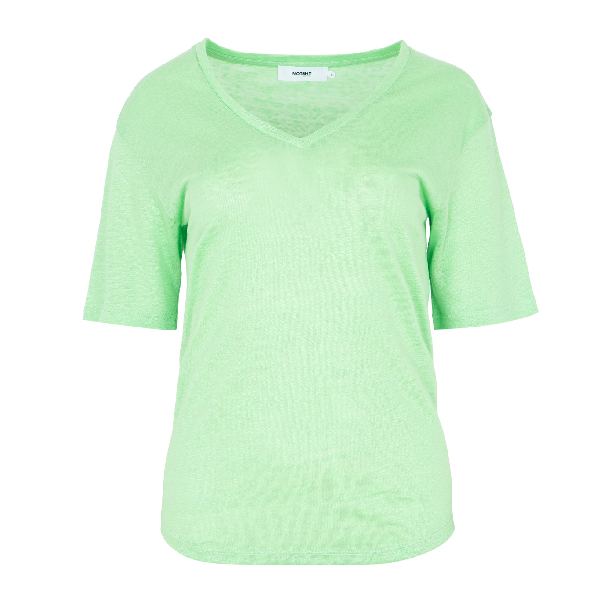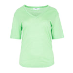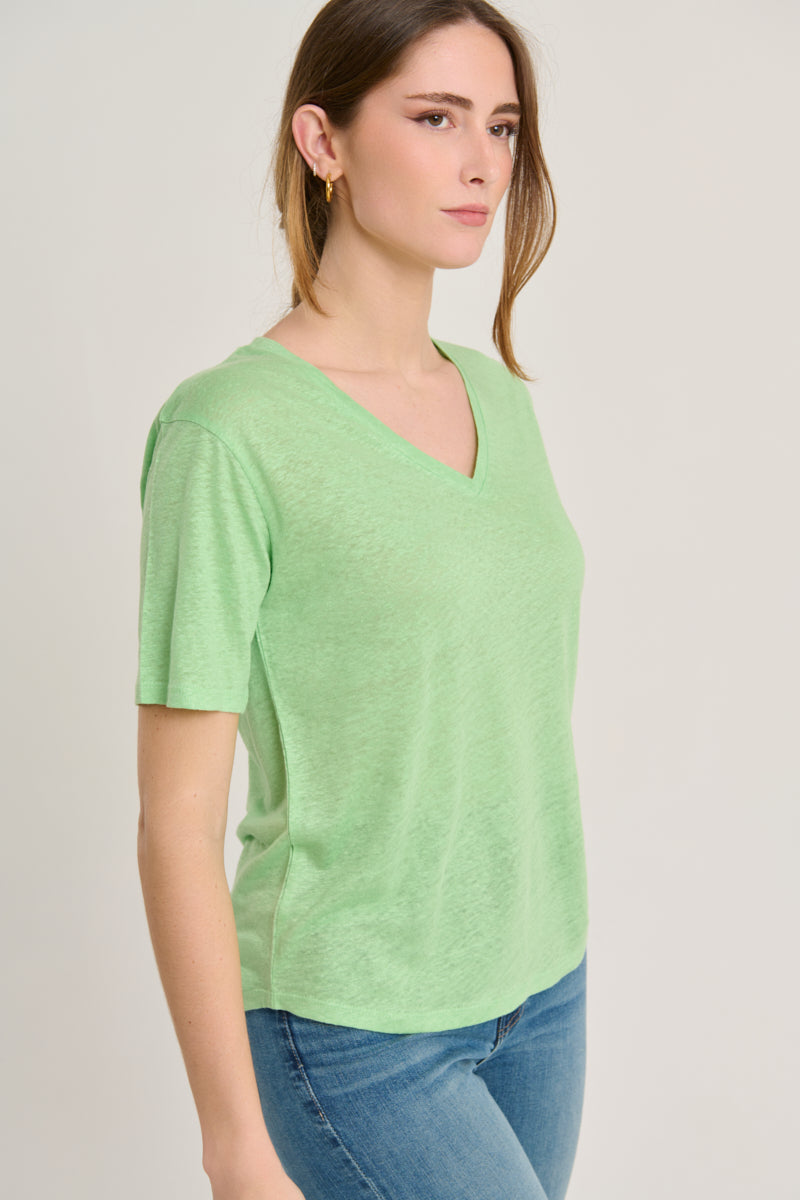Basic T-shirt with a V-neck, short, slightly asymmetrical sleeves. Rounded hem. Apple green. Composition: 100% linen.