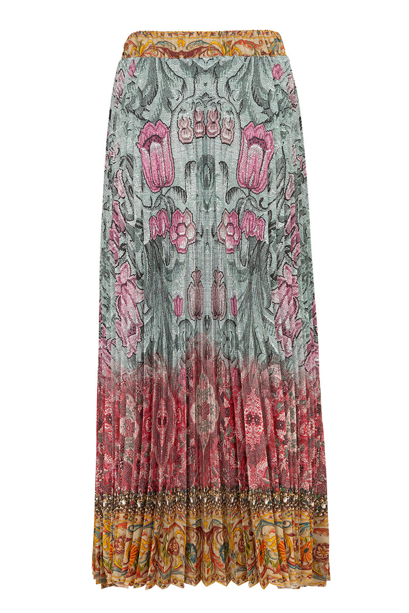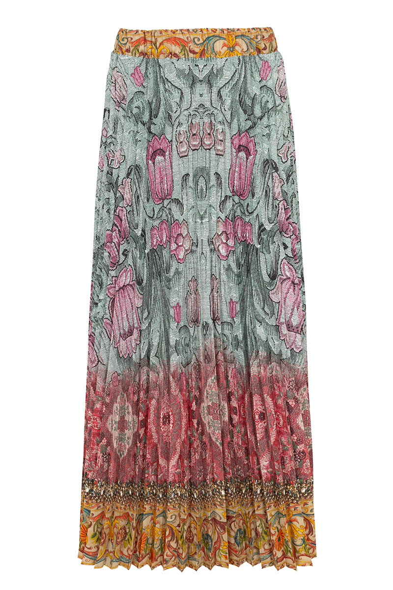 Long pleated skirt from the Italian brand Pierre-Louis Mascia. Tapestry-style floral print with baroque details, decorated with stones, sequins, studs, and vintage floral print. Elastic waistband. Composition: 100% polyester. Made in Italy. Italian sizing.