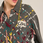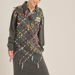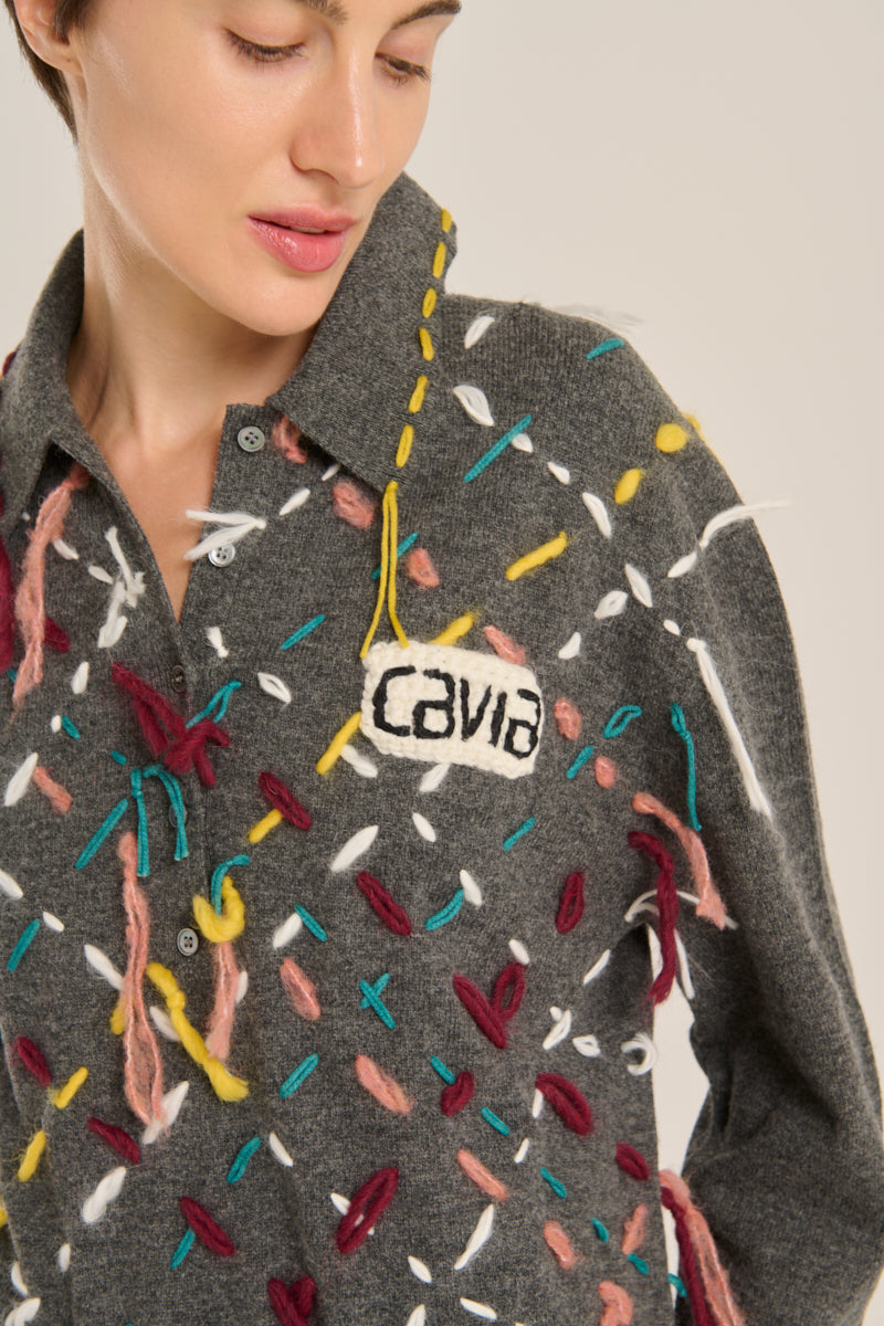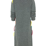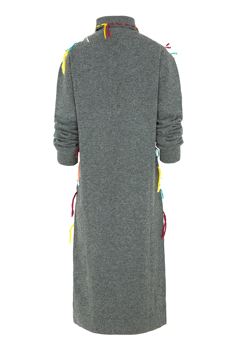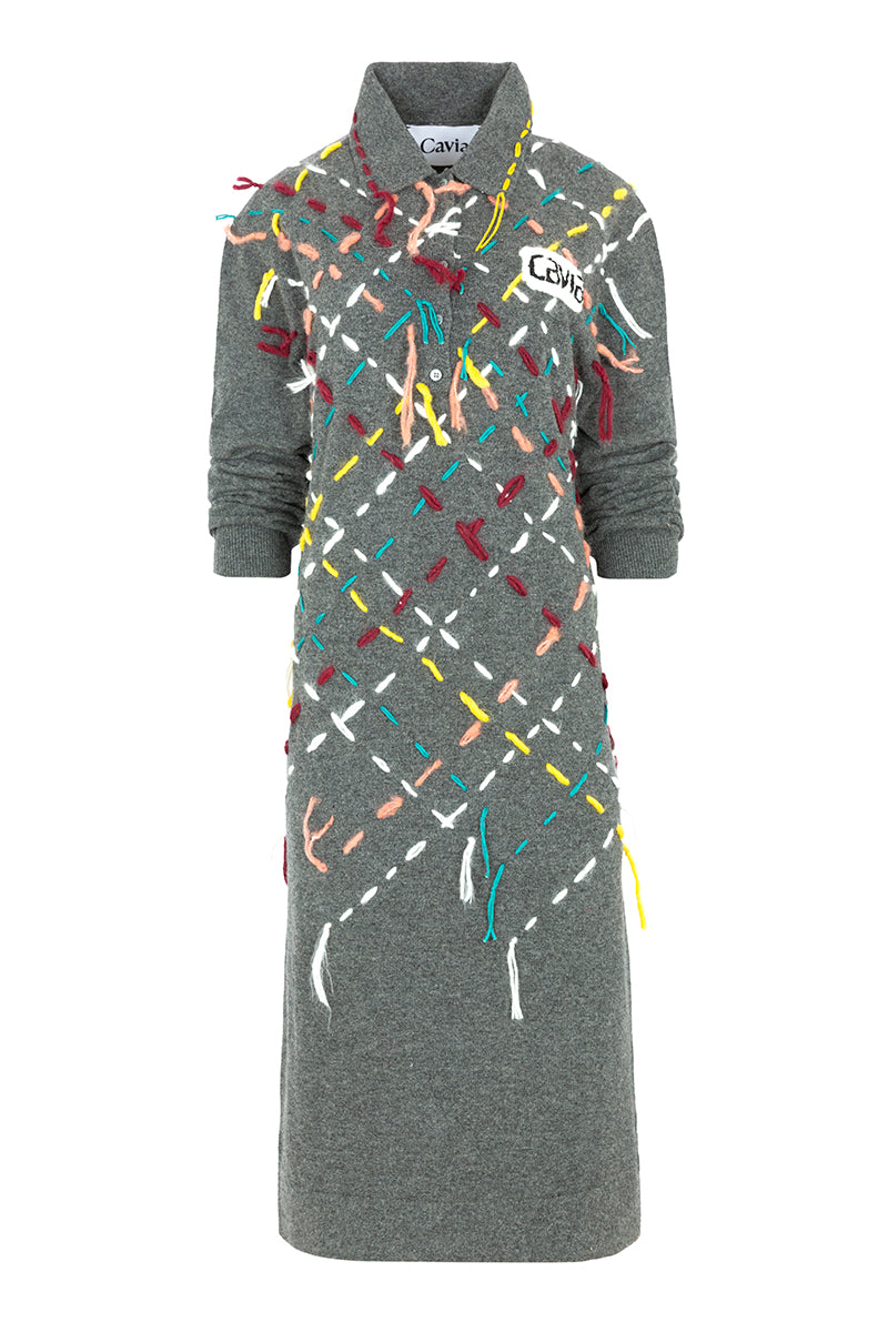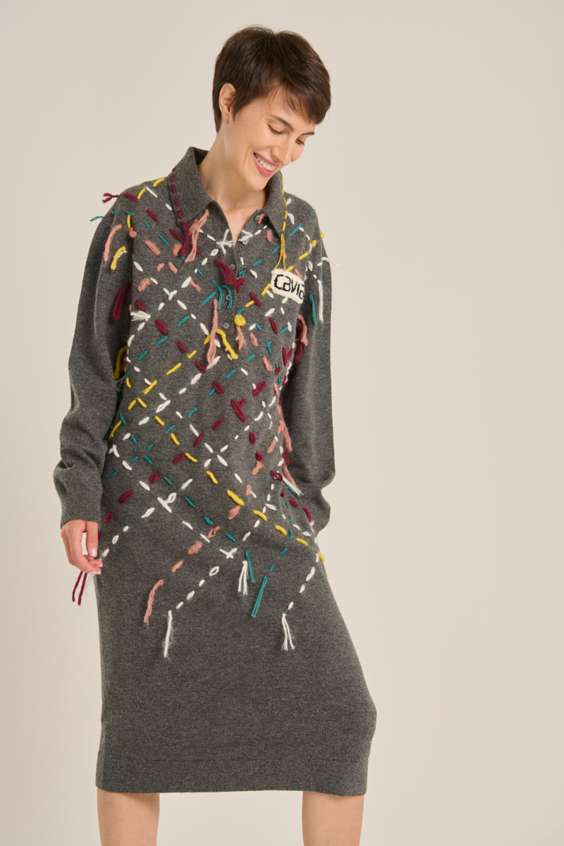 Midi dress from the Italian brand Cavia. Featuring a polo collar, a base in gray tones, and a detail of multicolored threads crossing in a diamond pattern. Mixed composition (upcycling), mostly wool. Italian sizing. Made in Italy. Italian sizing.