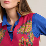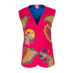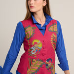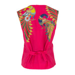 Flannel vest with front pockets and matching lined buttons. Peacock print on a burgundy background. 100% wool. Made in Italy, true to size.