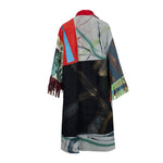 Patchwork leather and linen jacket by Gilles Ricart, kimono-style, multicolor. Hand-painted graffiti-style details. Combination of colors, fabrics, and leathers. Patch pockets. 100% Lambskin. 100% Linen. 100% Made in Spain. One size fits most.
