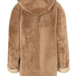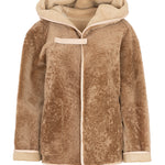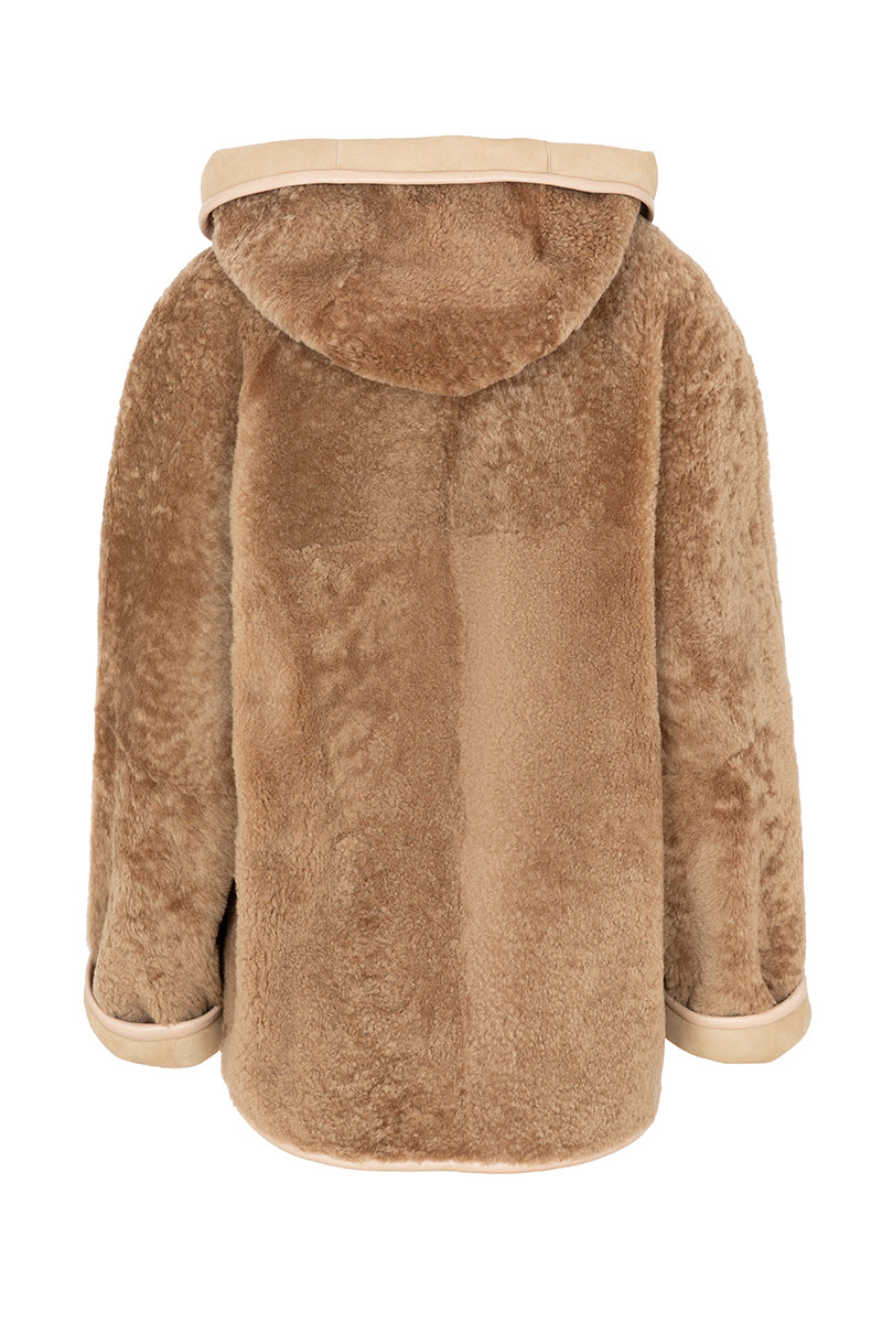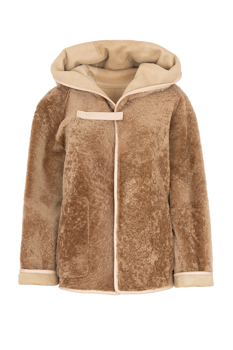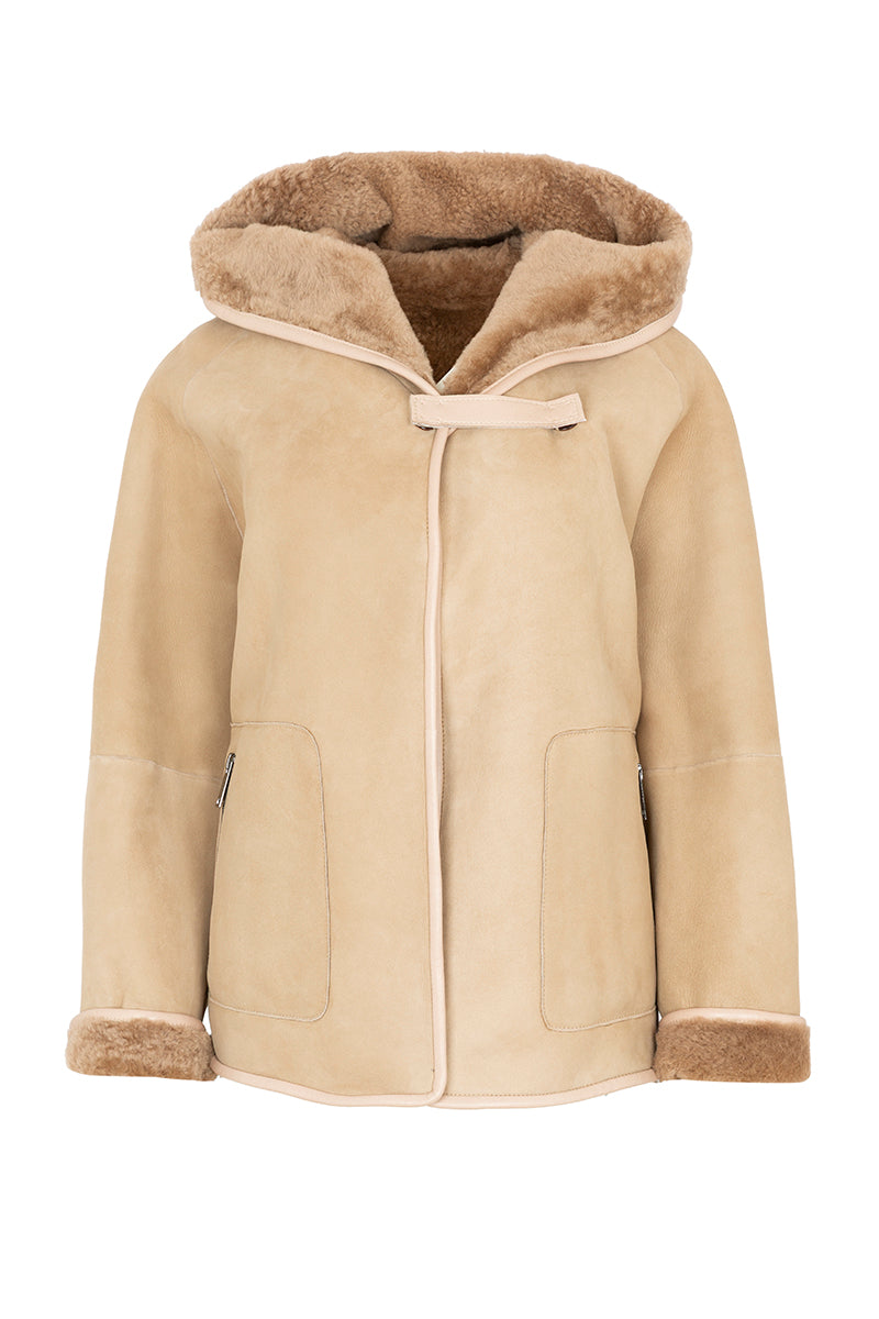 Chaquetón reversible , ante/ pelo, de cordero español. Piel ligera y flexible. Patrón con capucha , cruzado y ribeteado en cuero al tono .Cierre con trabilla de cuero con automáticos y bolsillos con cremallera. Color : arena . Composición: 100% cordero español . Hecho en España .