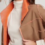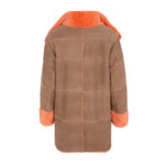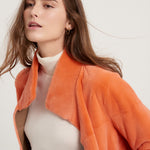 Unstructured, shaved mink fur jacket with a high lapel and reversible rope finish. Flowing pattern and reinforced interior pockets in nappa leather. Tangerine orange.