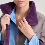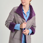 Unstructured, shaved mink fur jacket with a high lapel and reversible rope finish. Flowing pattern and reinforced interior pockets in nappa leather. Purple and gray.