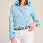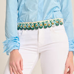 Italian brand Sara Roka belt in ivory grosgrain with a double-wrap, Swarovski trimmings and sequins in various sizes in shades of gray, light blue, khaki, and emerald green. Composition: 60% viscose, 40% cotton. Made in Italy.