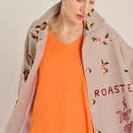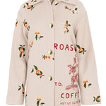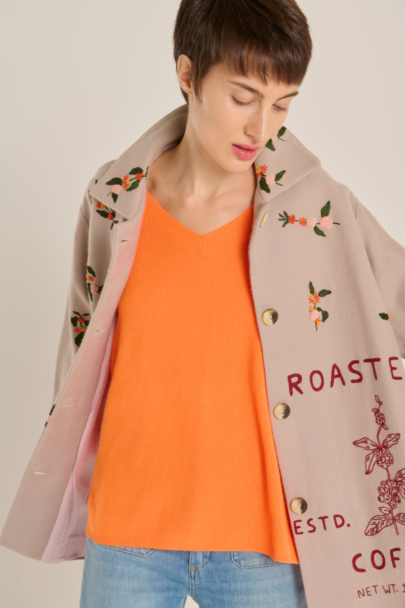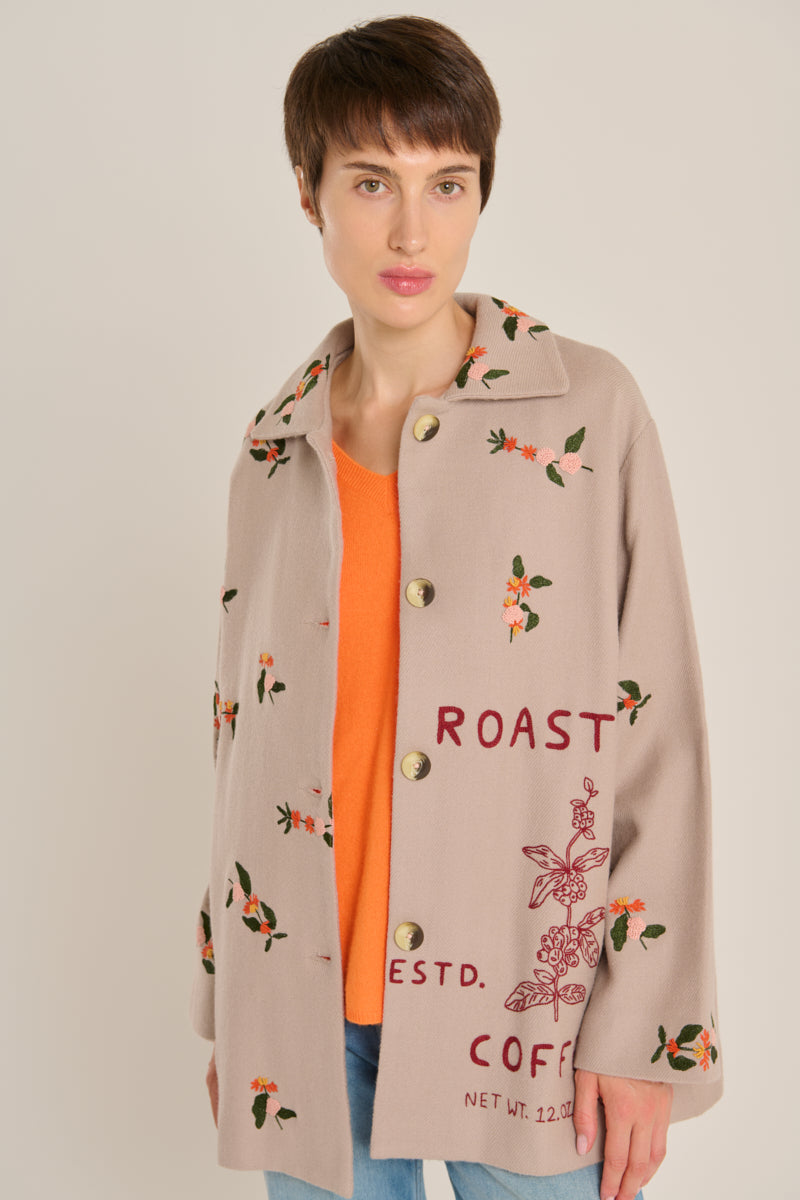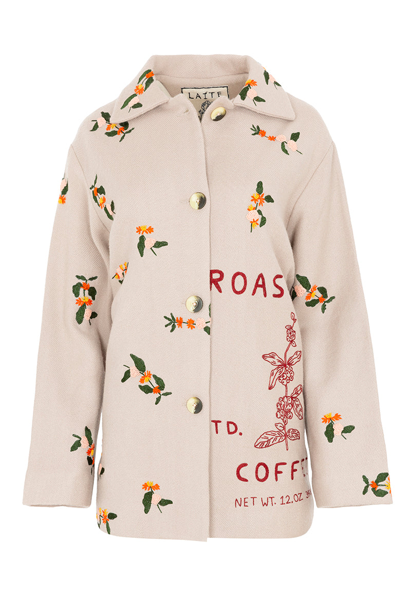 Abrigo corto evasé de la marca Laïte, con bordados artesanales esparcidos por toda la prenda formando ramilletes en naranja, rosa verde y amarillo, detalle también bordado en el lado izquierdo evocando la estampa de un saco de café y su planta en tono granate, todo esto, sobre un fondo malva empolvado, corte en media capa, cuello plano semiabierto, manga recta, bolsillo invisible y cierre con botones bicolor. Composición: 100% lana.