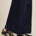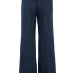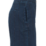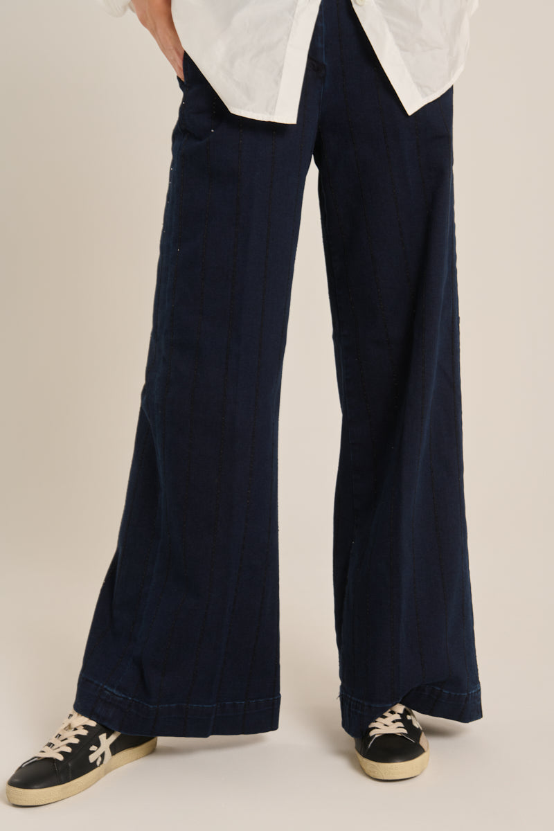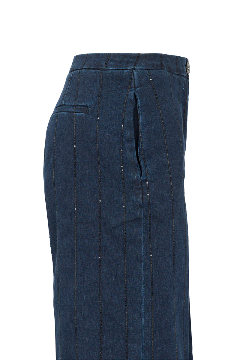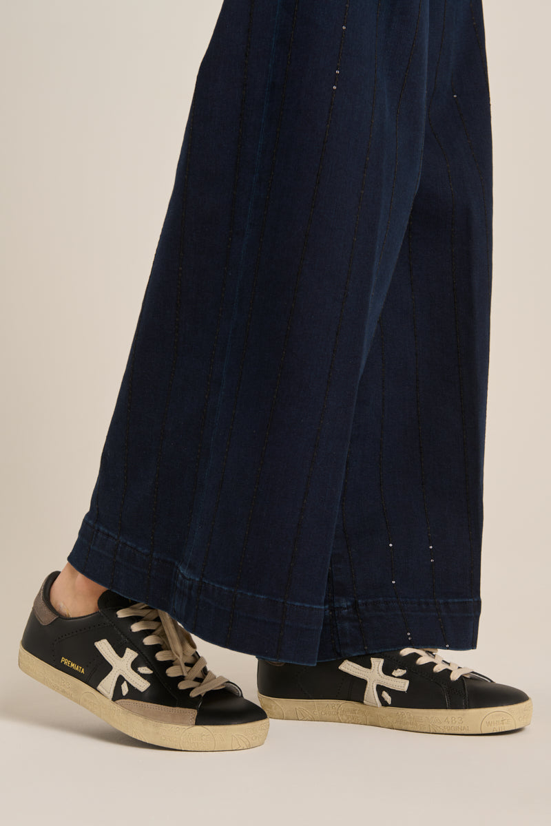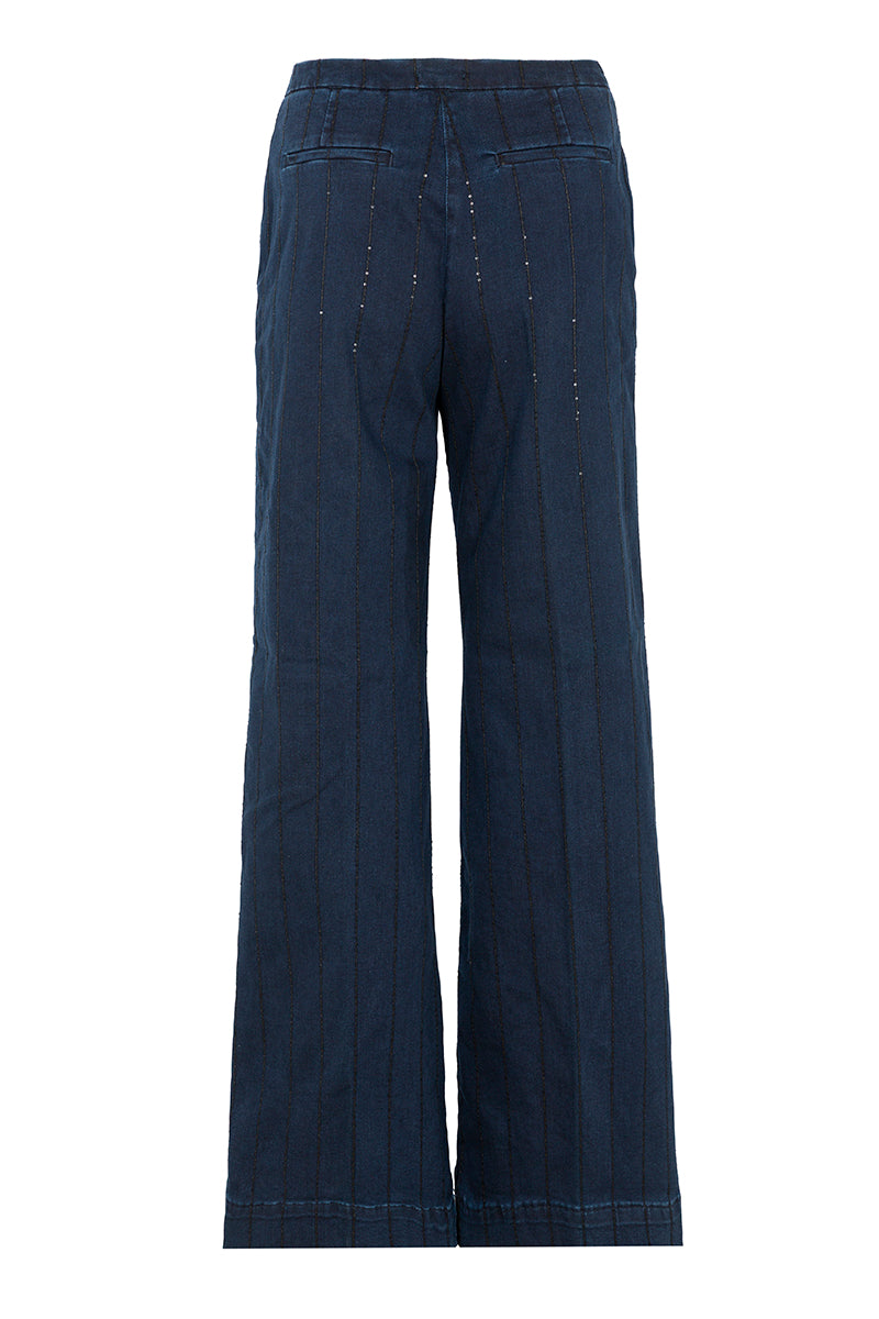 Chino-style denim pants with an oversized fit, from Shaft's "Fluide" line. Mid-rise, wide leg, side pockets and welt pockets on the back. Zip and jewel button closure. Detail of a fine row of sequins. Color Blue, artisanally treated, making each piece unique and special. Composition: 97% cotton 3% elastane. Made in Italy.