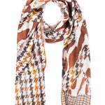 Pañuelo Pierre-Louis Mascia en seda natural. Su diseño de doble cara contrasta por un lado con estampado geométrico en pata de gallo en tonos blanco, marrón y azul, y por el otro, ese mismo estampado intercalado con bandas de animal print en tonos blanco y marrón.Composición: 100% seda. Desflecado medio. Tamaño: 65 x 190 cm. Hecho en Italia.