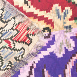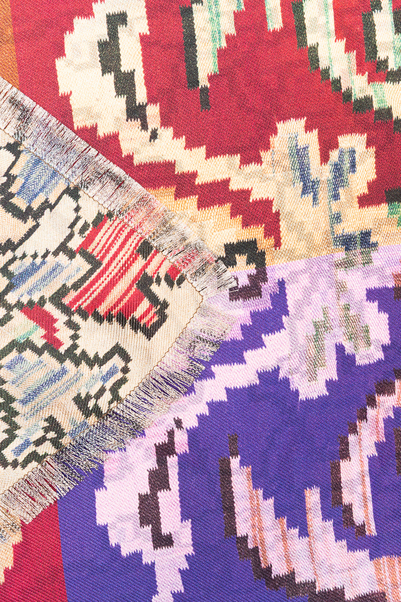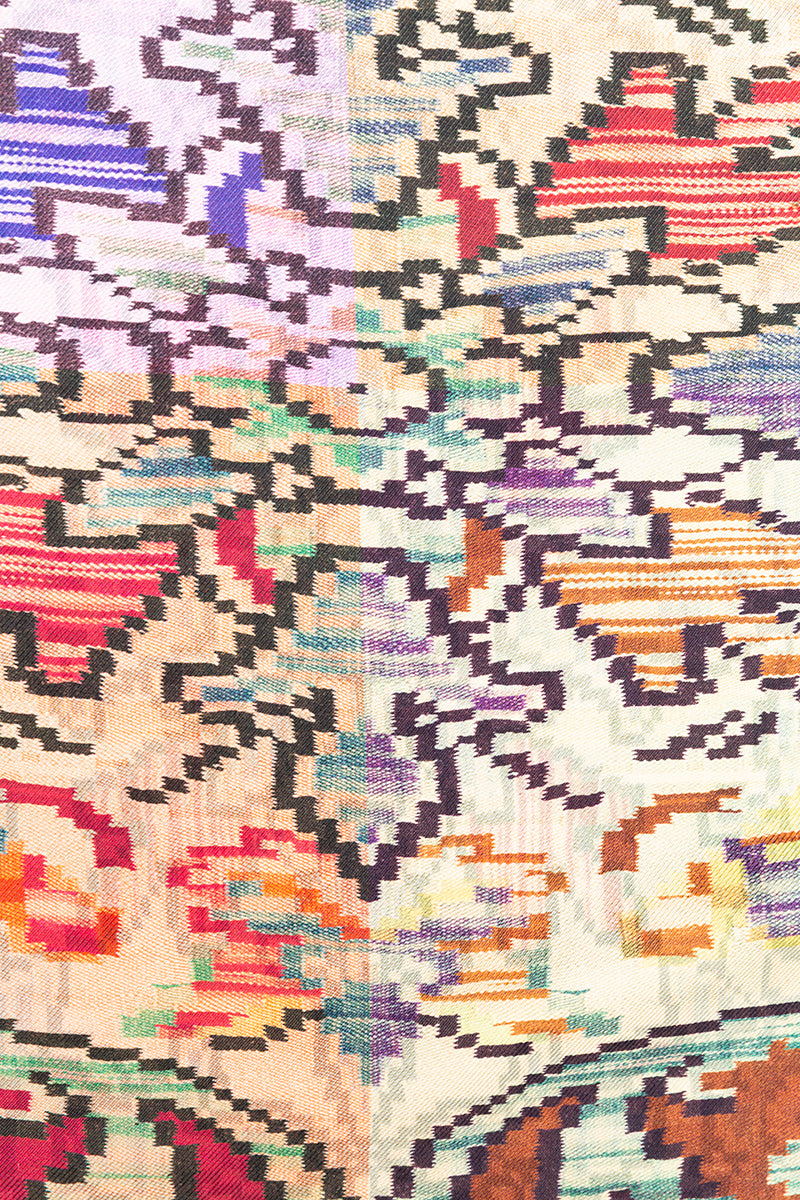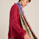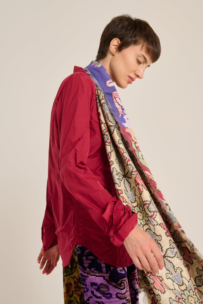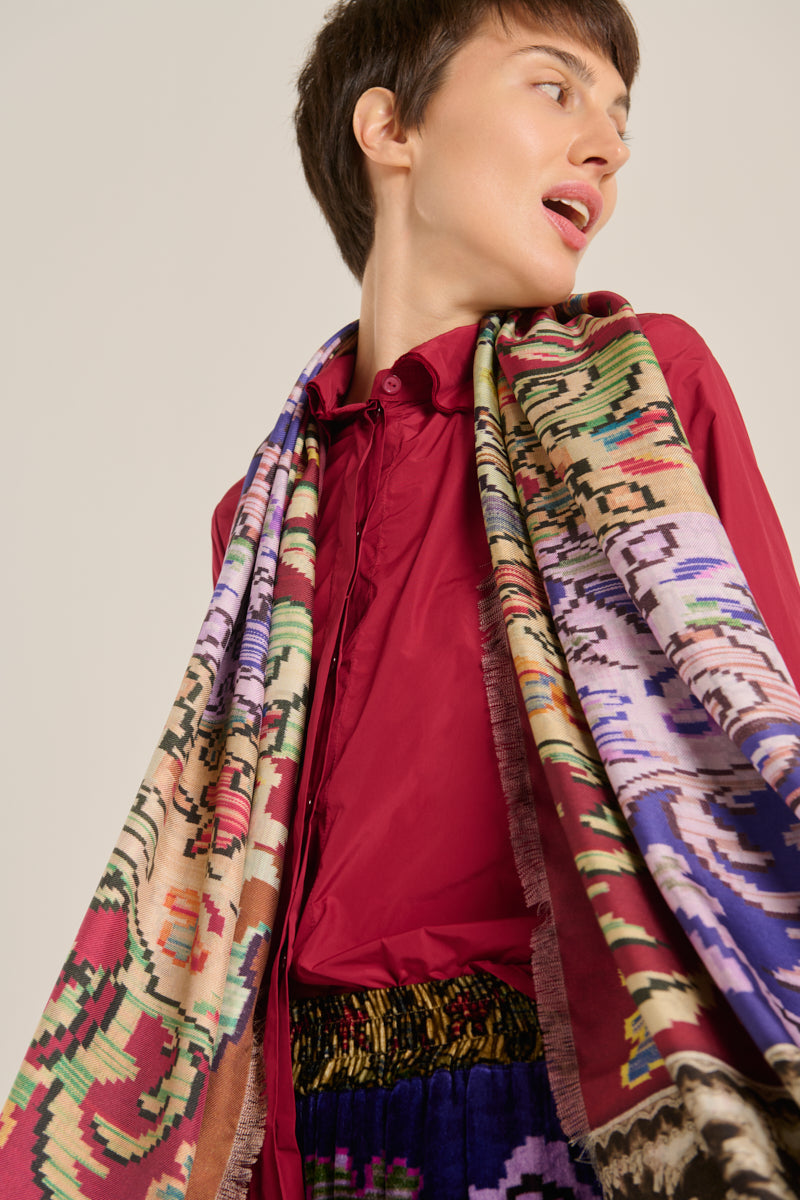 Pierre-Louis Mascia scarf in natural silk. Its double-sided design contrasts on one side with a Persian-style print framed between two borders in shades of garnet, mauve, green, brown, and ochre, and on the other side, with a geometric floral pattern in shades of garnet, green, blue, and brown on a beige background. Composition: 100% silk. Medium fraying. Size: 65 x 190 cm. Made in Italy.