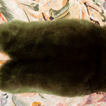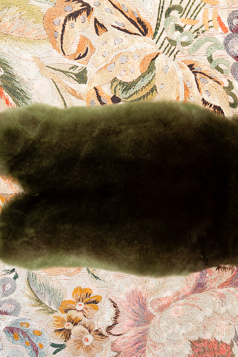Scarf from the Pierre-Louis Mascia brand in 100% natural silk. Floral print in shades of orange, green, and off-white. Double-sided. Central piece in green ORYLAG leather. Reverse side with small pink and white flowers on a green background. Small fringe finish. Size: 65 x 90 cm. Composition: 100% silk, 100% ORYLAG. Made in Italy.