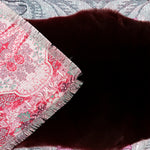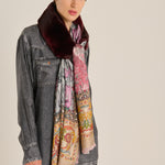 Pañuelo Pierre-Louis Mascia en seda natural. Su diseño de doble cara, contrasta por un lado, con un estampado floral tipo tapiz con detalles barrocos, rodeado por una cenefa con estampado de piedras, lentejuelas, tachuelas y un toque vintage, por el otro, estampado floral en tonos burdeos grises y verdes. Pieza central de Orylag en color burdeos. Composición: 100% seda. Desflecado medio. Tamaño: 65 x 190 cm. Hecho en Italia.