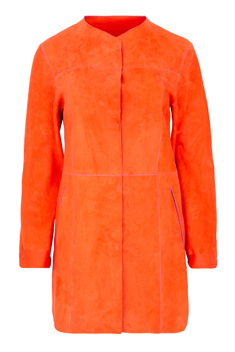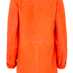 Levita de piel de cordero español acabado en ante , sin cuello. Color coral y detalle de hilo en tono morado. Cierre con botones automáticos. Composición: 100% Cordero español. Fabricado en España.