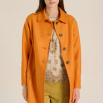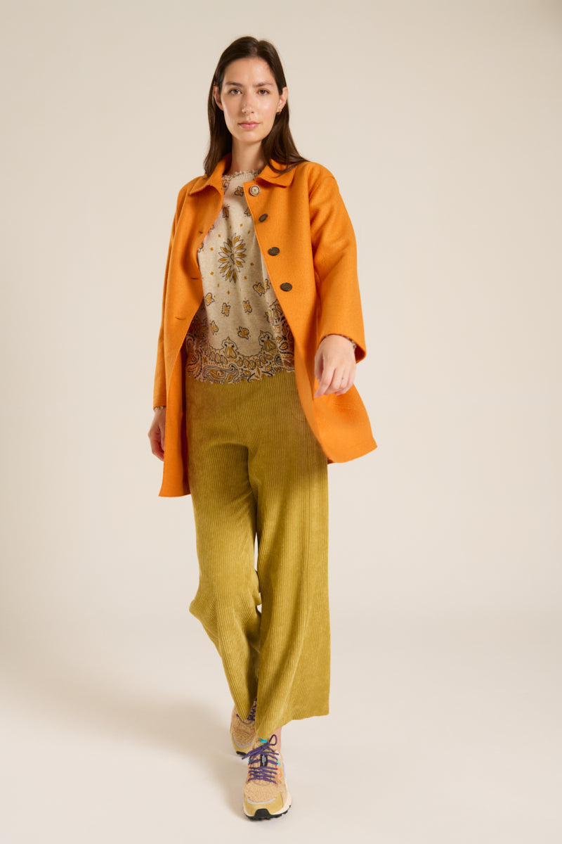 Straight wool coat with a shirt collar, mandarin color with front pockets and a 4-button closure. Composition: 100% virgin wool. Italian sizing. Made in Italy.