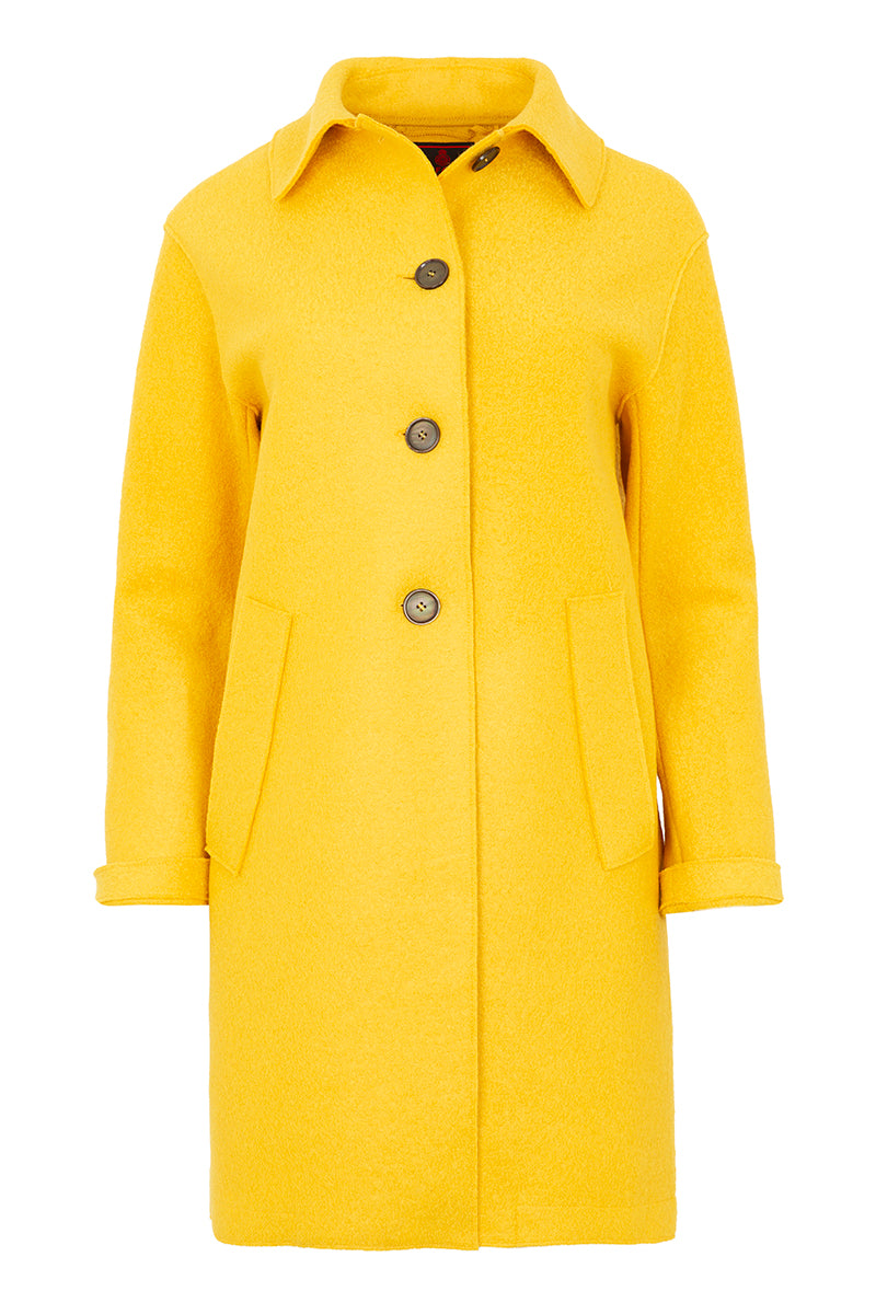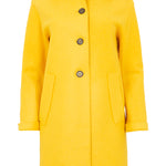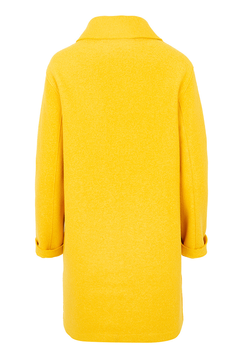 Straight wool coat with a shirt collar, polenta yellow color with front pockets and a 4-button closure. Composition: 100% virgin wool. Italian sizing. Made in Italy.
