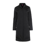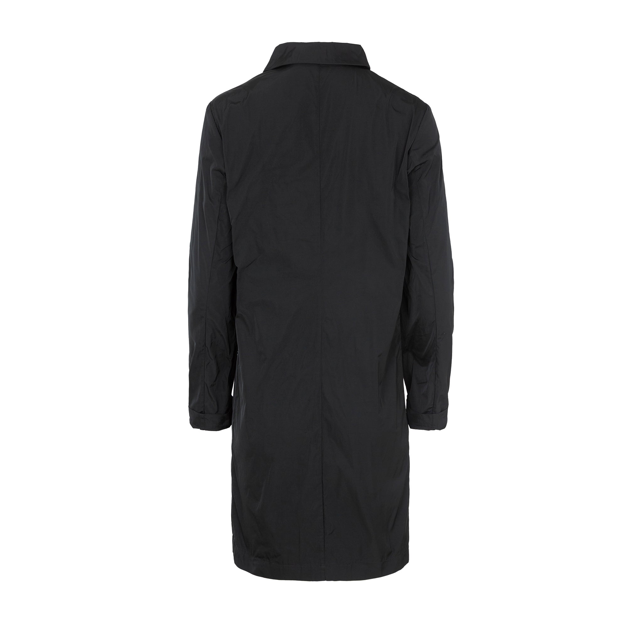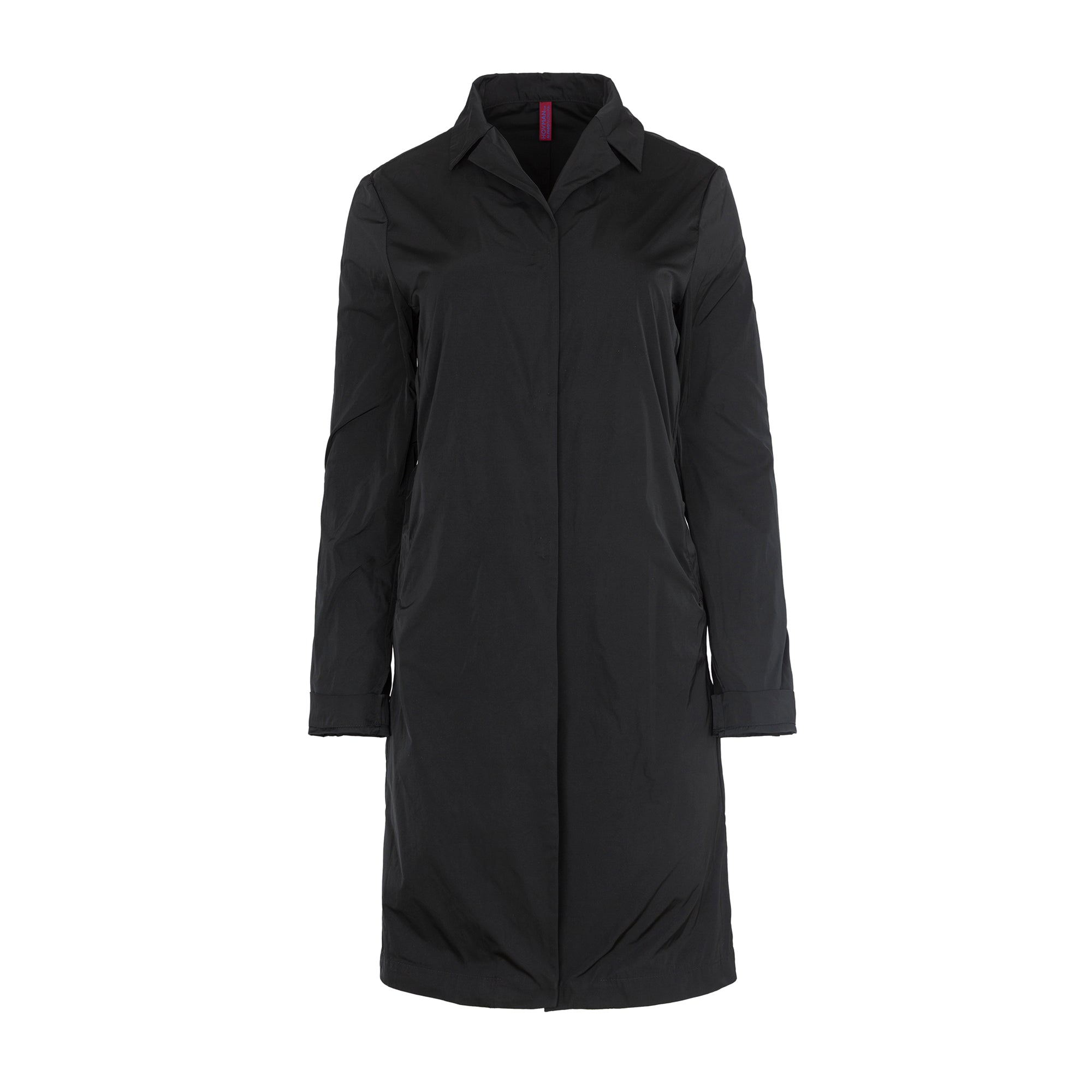 Technofabric trench coat. Lapel collar, metal snap closure, side pockets. Black. Composition: 100% Polyester. This fabric cannot be ironed. German sizing.