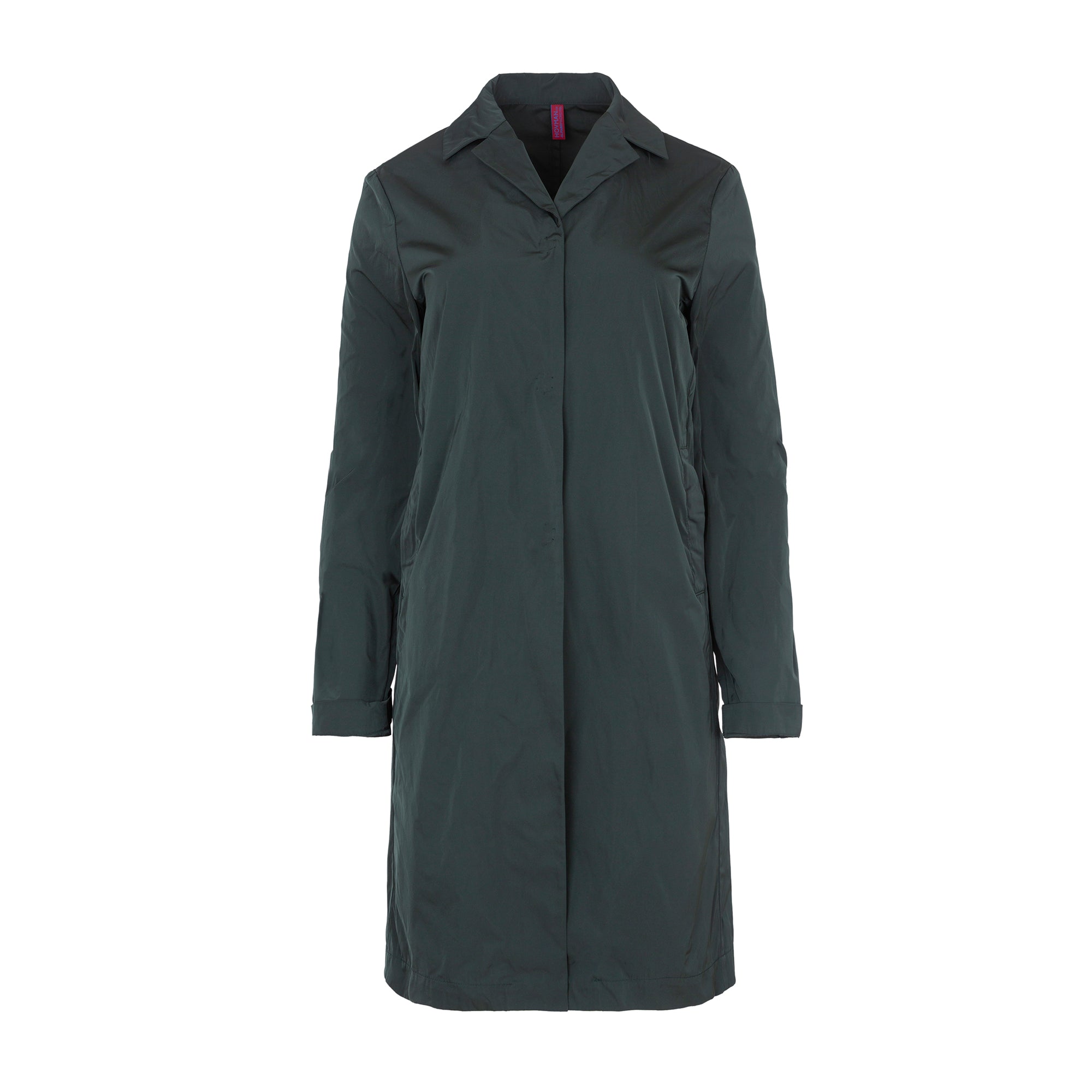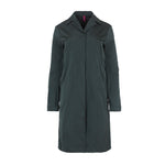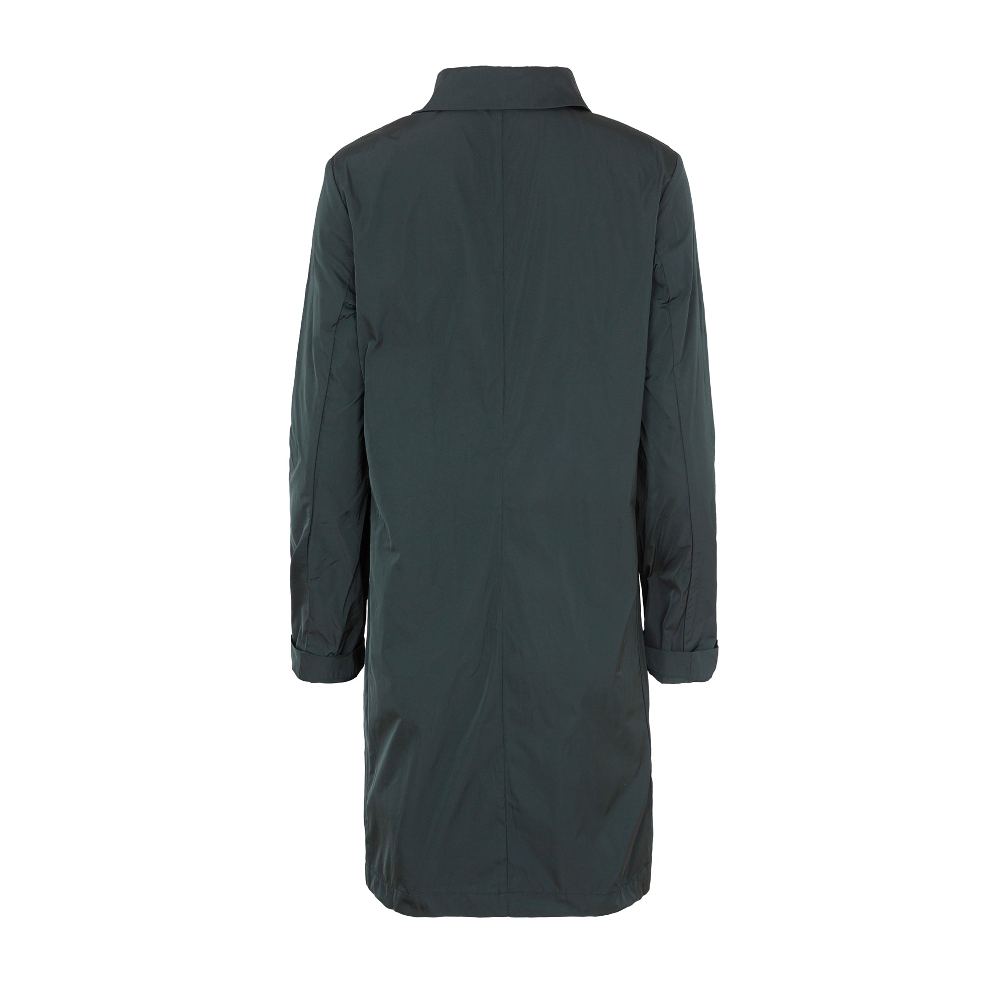 Technofabric trench coat. Lapel collar, metal snap closure, side pockets. Midnight green. Composition: 100% Polyester. This fabric cannot be ironed. German sizing.