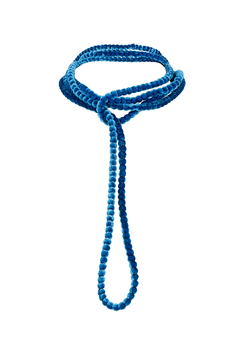Collar largo de bolas forradas de terciopelo en color azul. Posibilidad de combinarlo con varios colores.