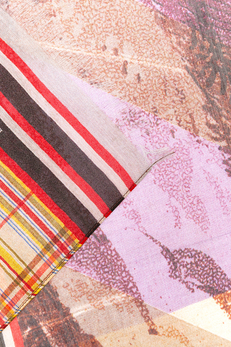Pierre-Louis Mascia scarf. Geometric and abstract print in black, red, yellow, pistachio, and purple tones. Composition: 73% cotton, 27% silk. Medium fraying. Size: 65 x 190 cm. Made in Italy.