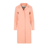 Herno brand trench coat in pale pink neoprene. The garment is laser-cut with hidden pockets and heat-sealed seams. It features a mid-calf length with a lapel collar, a covered snap button closure at the front, and a structured design. Composition: 75% Polyamide, 25% Elastane. Ref: CA00521D-13455S-4170