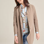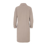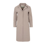 Herno trench coat in taupe neoprene. The garment is laser-cut with hidden pockets and heat-sealed seams. It features a mid-calf length with a lapel collar, a covered snap button closure at the front, and a structured design. Composition: 75% Polyamide, 25% Elastane. Ref: CA00521D-13455S-2600