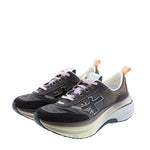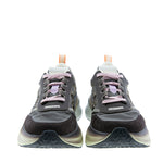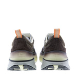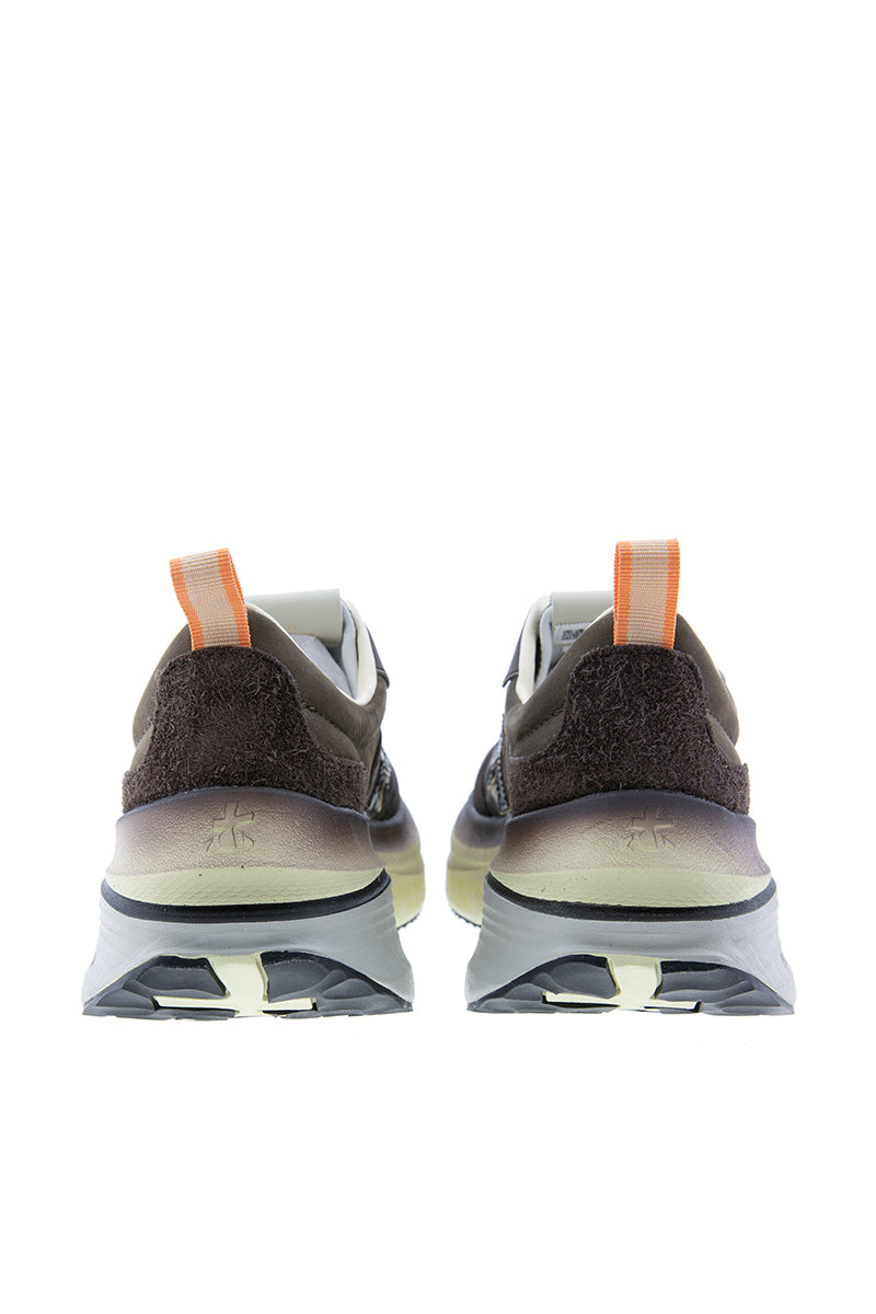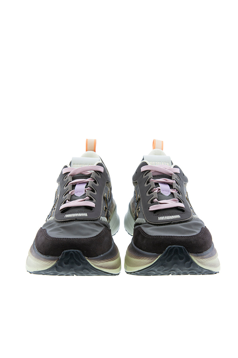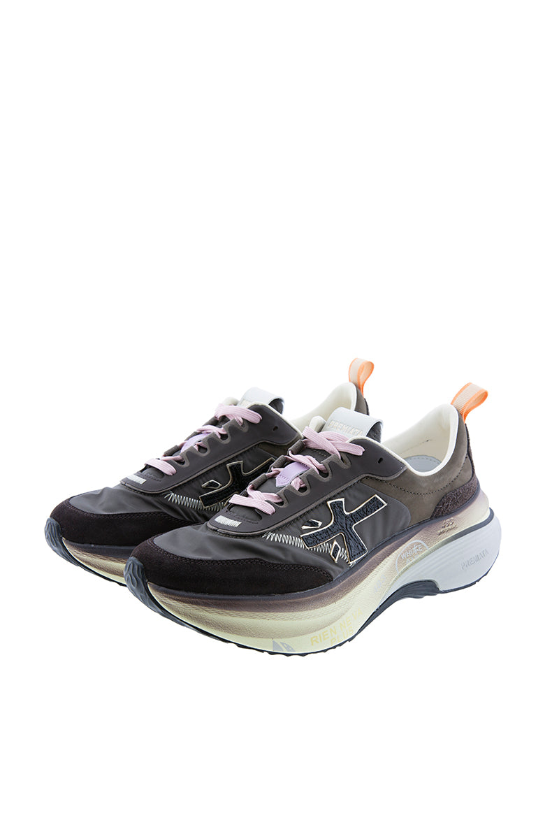 Hill sneaker, variant 7896. Exterior fabric in chocolate-colored nylon with logo and matching suede heel counter. Pink cotton laces. Extra comfort gradient sole.