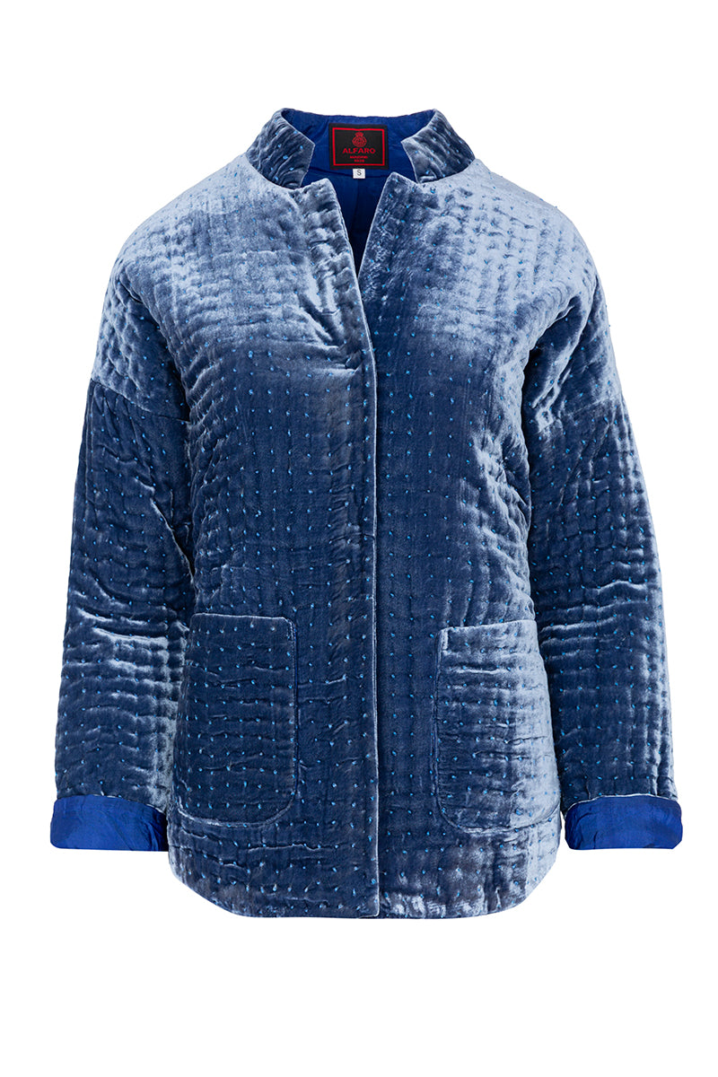 Quilted velvet jacket with small light blue embroidered dots. Inverted shirt collar, patch pockets on the front, side slits, and rounded hem. Blue color with contrasting lining in a different blue.Composition: 78% viscose, 22% silk.