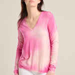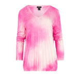 Long-sleeved, straight-cut V-neck sweater from the Italian brand Avan Toi. Knit front and sleeves, and back in fuchsia and white marbled silk. Front: 70% Cashmere, 30% Silk. Back: 93% Silk, 7% Elastane. Made in Italy. Italian sizing.