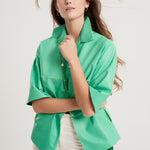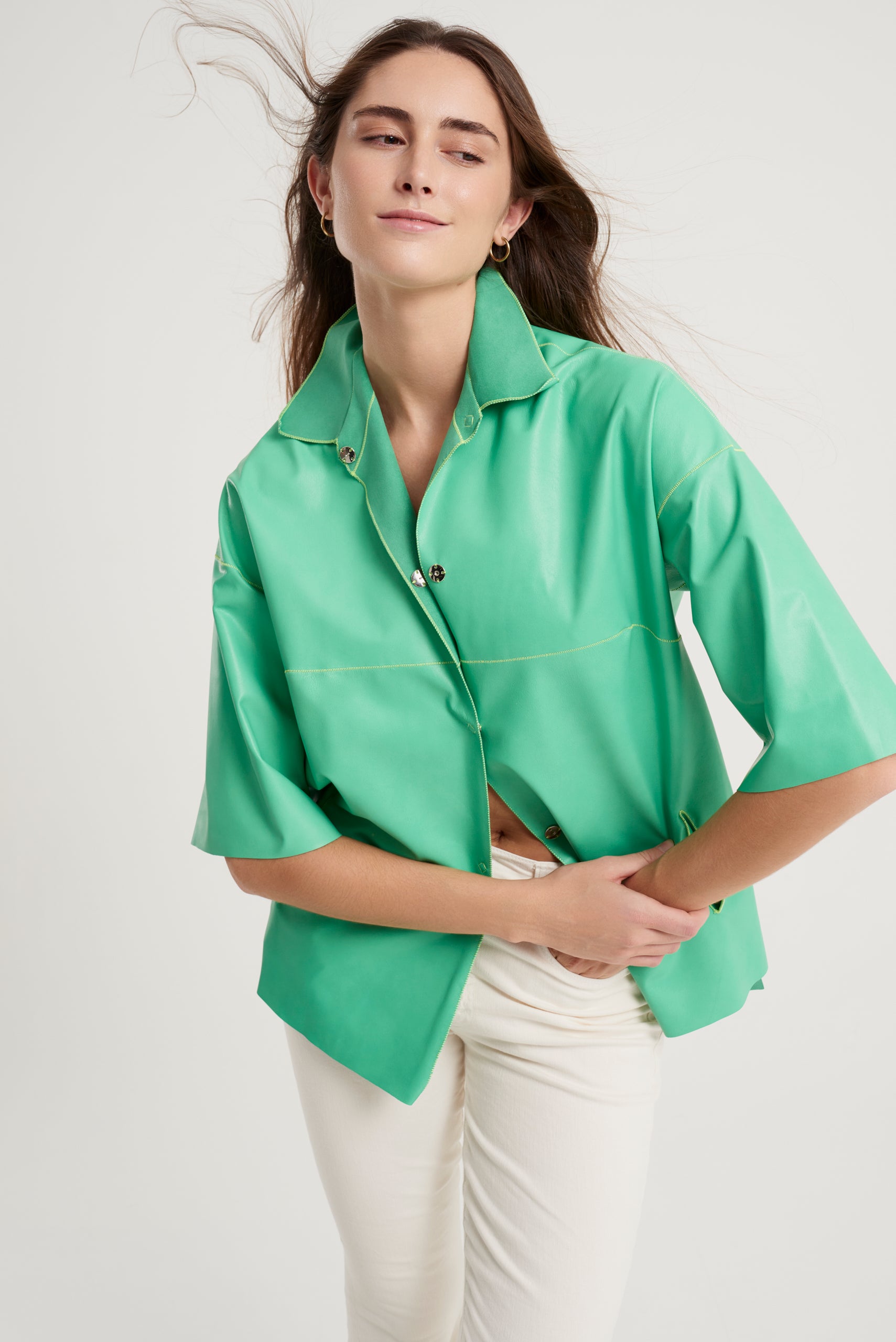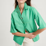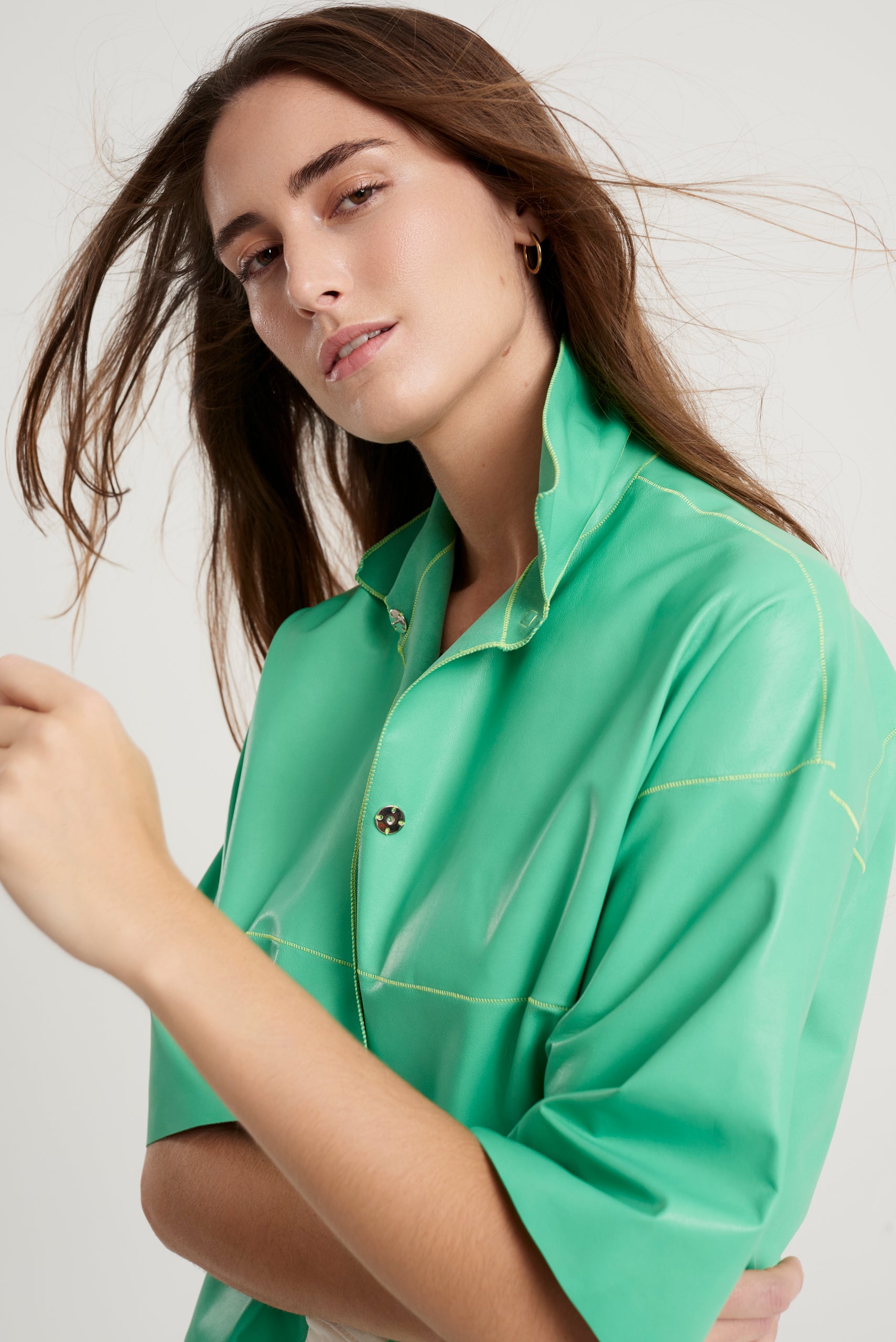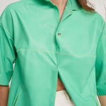 Spanish lambskin frock coat with a nappa leather finish and a shirt collar. Apple green with fluorescent lime thread detailing. Short sleeves and snap button closure. Composition: 100% Spanish lamb. Made in Spain.